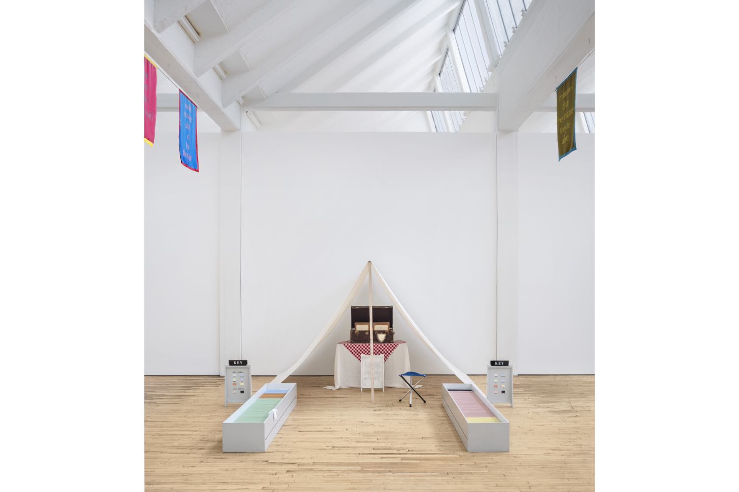 Dia curator Jordan Carter eschews many of these early works and easy classifications: the early installation works Sites of Genealogy (1990) and Commemorative Toile (1992–93) that put her on the proverbial map are notably absent. One of her other best-known works — 1992’s incisive archive/video installation Import-Export Funk Office — is included in the exhibition as The Digital Import/Export Funk Office [CD-ROM Brochure] (2011), a digital print that appears on paper as the “liner notes” for the project in both English and German. Instead, Carter focuses on a specific mode of inquiry and subject matter to guide the exhibition — the narrative of exploration and colonial expansion — as showcased by the inclusion of two rare sculptural installations exhibited for the first time since their 1991 debut at New York’s Pat Hearn Gallery. Both the first and last work one sees in the venue, Peak (1991) serves as the exhibition’s mission statement: a precariously arranged wood monolith erected to mimic the once-impossible summits of Everest and Denali, and a blue flag labeled “OLYMPUS” flying above a black-and-white Ansel Adams photograph of a mountain range. This is a condemnation of both the colonial nature of scientific exploration and of the American turn toward land art, implicating both in their need to control the natural, indigenous lands of the Americas from Manifest Destiny to Robert Smithson’s earthworks. In the next gallery, Pigskin Library (1991) presents an imagined mise-en-scene of President Theodore Roosevelt’s campsites during his 1909 expedition to Kenya, the Democratic Republic of Congo, and Sudan to collect samples of plant and animal life for the nascent American Museum of Natural History. File folders of taxonomical findings spill out of a small tent as John Philip Sousa’s 1890 march “The Corcoran Cadets” — an ode to the capitol’s militia drill team — plays, further linking the Western world’s “scientific” observations of the African continent to regimes of power and subjugation.