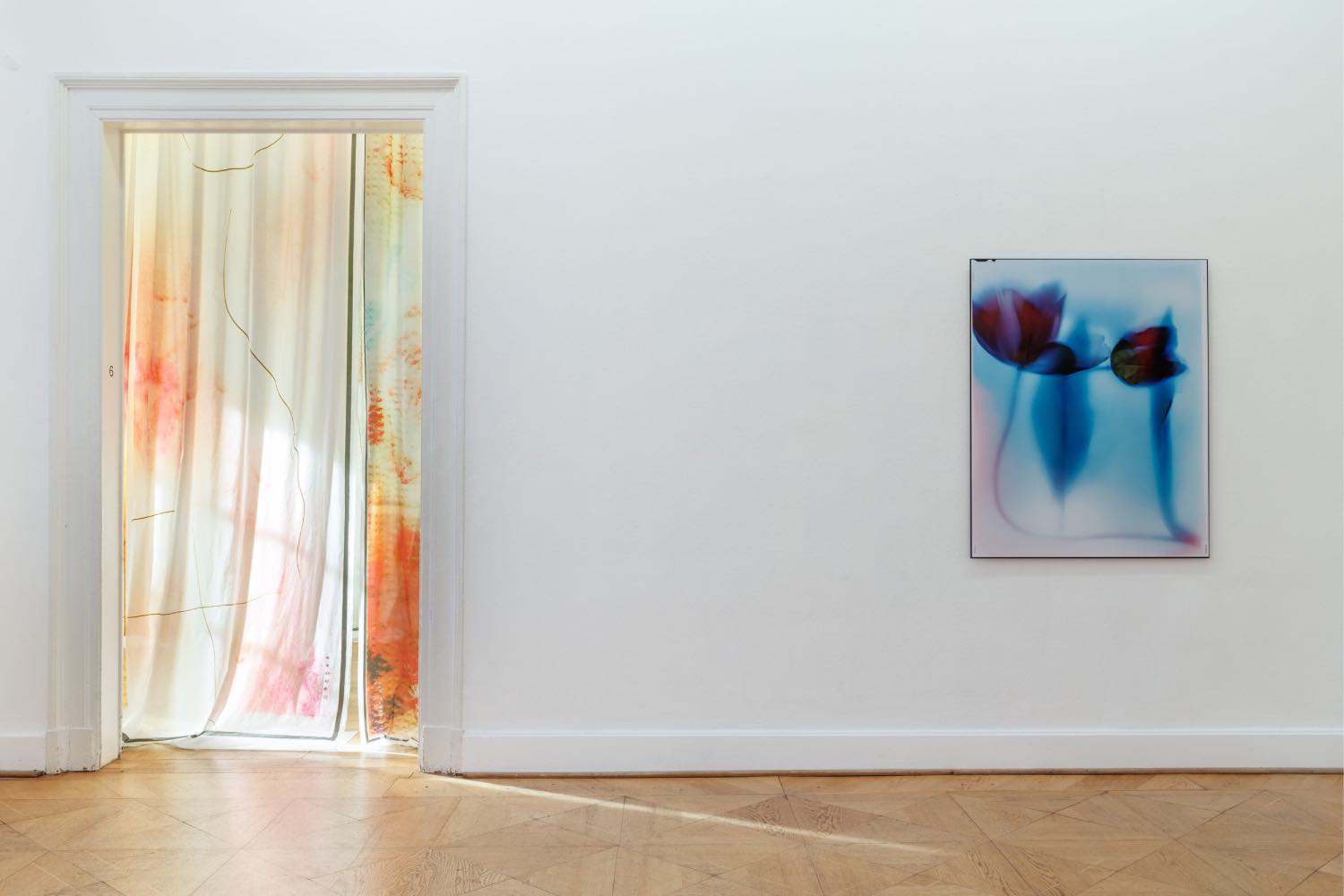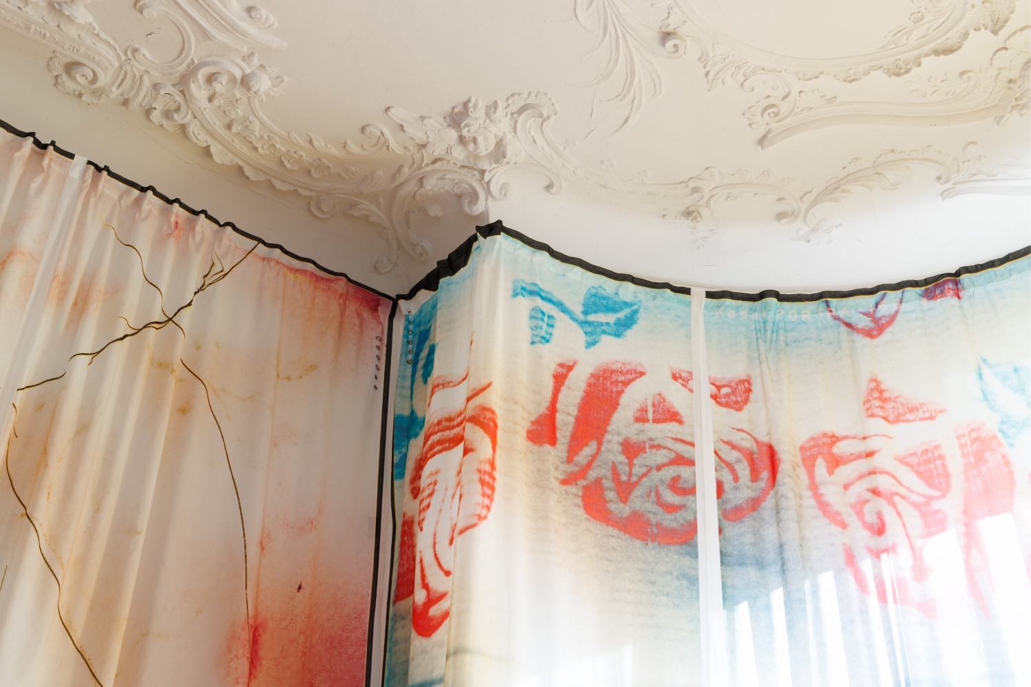 The exhibition occupies half of the Kunstverein’s Venetian-style villa — six rooms across two floors. The first two rooms on the ground floor house two striking installations, each using floor-to-ceiling transparent fabric curtains printed with enlarged photographs — a recent signature of the artist. The first, Swan Veil (2025), spans the width of the grandest room in the villa, the Spiegelsaal (hall of mirrors), and hangs toward the back of the room. A repeated motif of a swan is printed on the fabric which combine with vivid shades of green and blue, with a bright white line that appears as if a magic fluorescent wand had been swished over the image. The regal symbol of the swan seems fitting for such a grand, imposing space flanked by windows, mirrors, and wall paintings. Alexi-Meskhishvili works with these otherwise incongruous elements, using the translucency of fabric to coalesce her works with the space they inhabit: the light flooding through the windows behind imprints their image onto the curtain; the impressive chandelier that hangs in front is reflected in the mirror behind, appearing on the textile’s surface as bright star-like dots; the other mirrors in the hall reflect the installation to create multiple copies of the scene.
