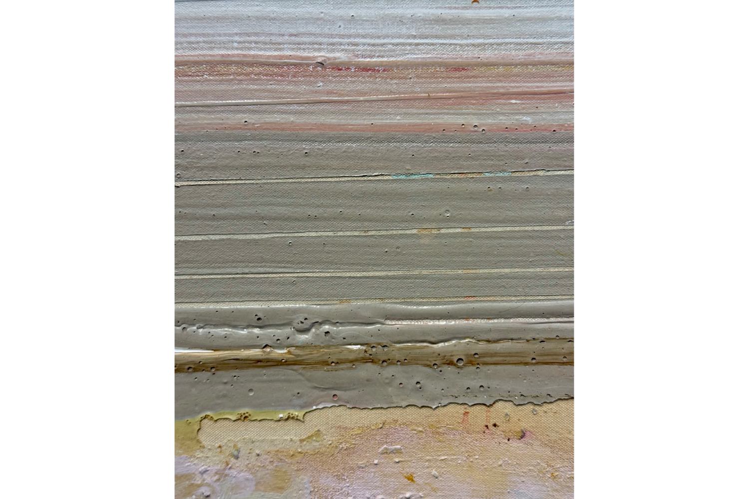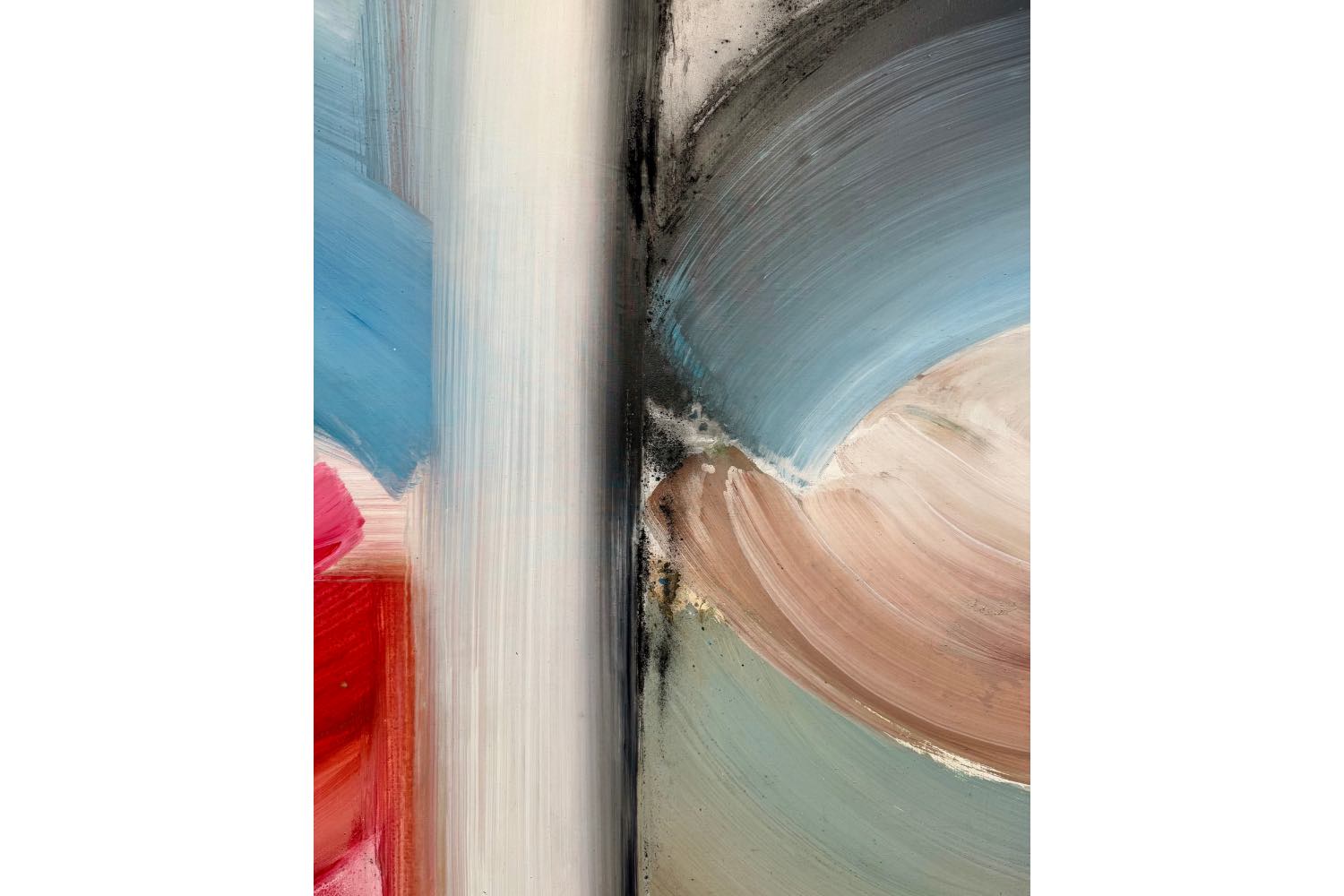 One standout moment in the show is Untitled (Acrylic #1 from the series Louisiana) (1978), in which Clark channels the landscape of the American South through abstract means. Dividing the canvas into three horizontal zones, the artist evokes earth, sky, and water using acrylic applied with brooms and his hands. The palette —rich in pinks, blues, and beiges — feels both atmospheric and deeply personal, a tribute to the sensory memories of his early life.
