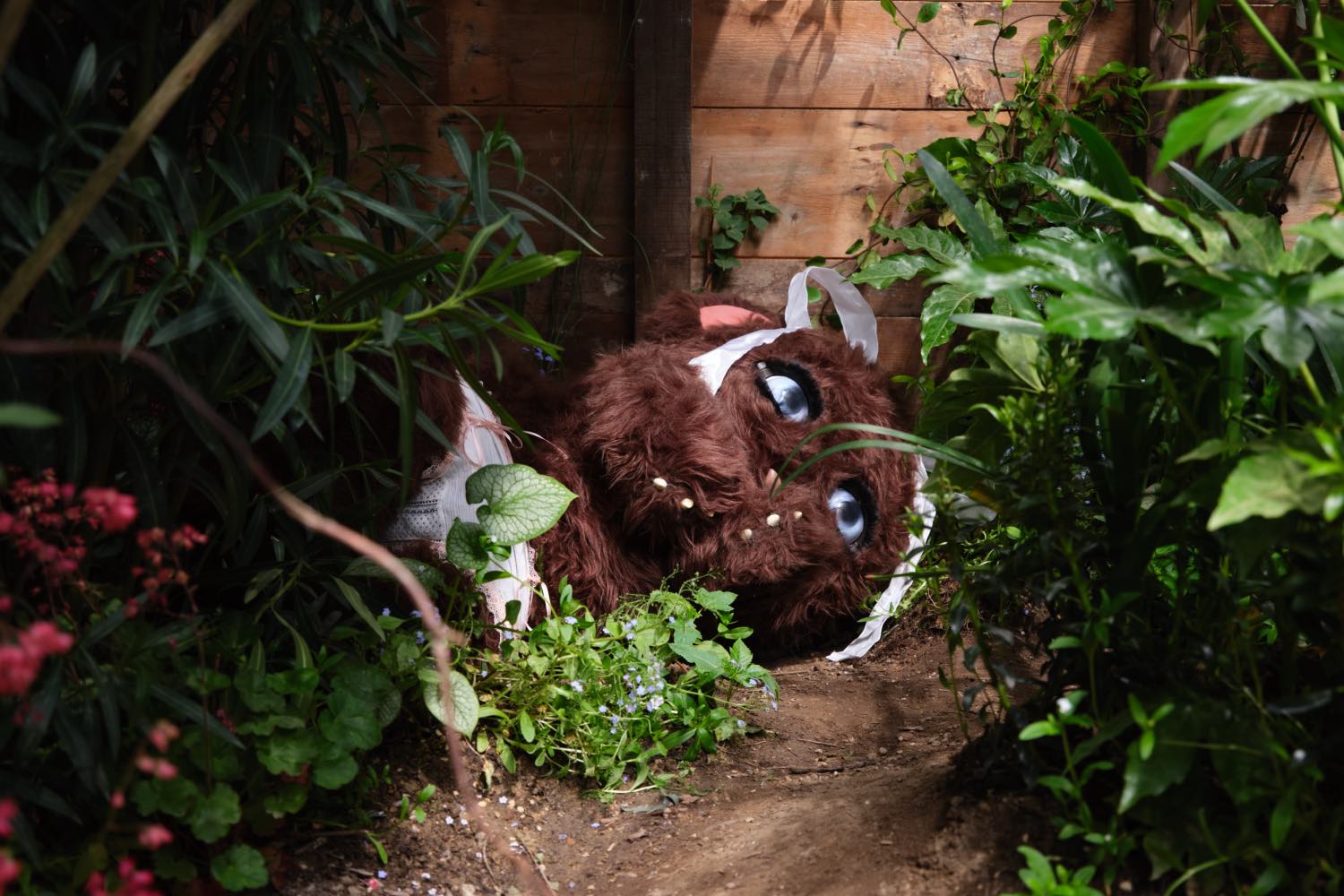 PO: The energy doesn’t change. You know what I mean? I think when we were thinking about the idea of dancing with demons or the demonic – and you can’t have a demon without the divine – then that energy of summoning, just that actual movement of time and space doesn’t change. Even if it takes a new form here, which I think it does, it still is wrapping everything, which is so beautiful. The fog is still taking over. Even my greenhouse has become a new form here. It’s more intimate, it’s tight. It’s a very one-on-one experience. And then you have the library — Dozie Kanu reimagined it in this way. The energy doesn’t shift, it just changes. And that’s the divine and the demonic together, the unconscious dream. Then you land in Carsten Höller’s bed.