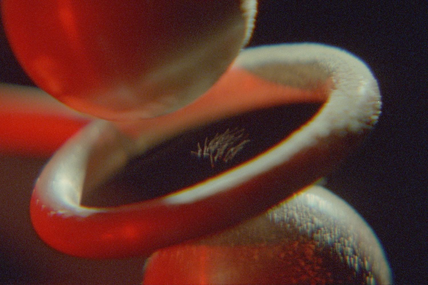 In Wirepiece (2022) and its evolving variations, a loop of 16mm film acts as both bow and player. Threaded through a tilted projector, the celluloid grazes a snare drum string suspended floor to ceiling. Each tinted frame pulses against the walls, the string releasing a silvery flutter. The space quivers, performing as much as it projects. Film here is no longer inert — it is vibratory, sonorous, live. Signals traverse air, architecture, and body, collapsing the conventional boundaries between medium and message.