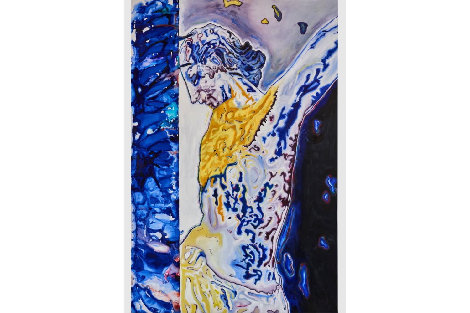 As I move through the space, I am struck by how many of the works are about fragment: never whole bodies, but parts. Torsos lie horizontally, as if resting. Schwindt was inspired by the way sculptures are stored in museum depots: not standing upright as we might expect, but lying down, cushioned, carefully protected. That posture – vulnerable, passive – repeats across her large-scale paintings, her watercolors, her sculptures.