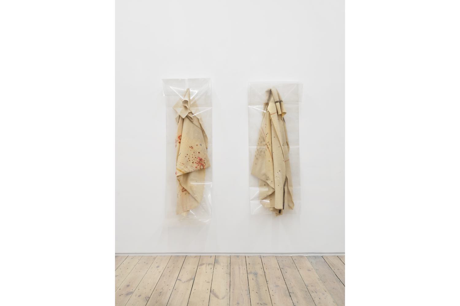 Yet unlike Emin, Magor’s focus is less confessional and more attuned to the quiet relationships between the materials themselves. The hidden lives of objects take center stage. There’s an interplay of material richness, tenderness, nostalgia, and unease – particularly in Being This (Alaric’s Boutique), in which a crowned eagle emblem is affixed to the chest of a cozy autumn jumper. This detail, later revealed as the Polish coat of arms, introduces a quiet disruption to the garment’s warmth, hinting at historical weight. That tension continues in Open and Closed (2018), a diptych of salvaged wool blankets wrapped in polyester foil and stained with reddish dyes. The foil evokes dry cleaning bags or forensic preservation, the stains heightened rather than obscured, as if amplifying the trace rather than erasing it. The fabric is burned through, each small hole haloed with pigment, blooming across the surface like a constellation of tender scars. Like ghostly, soft carcasses, these works hover between care and aftermath, preservation and exposure.