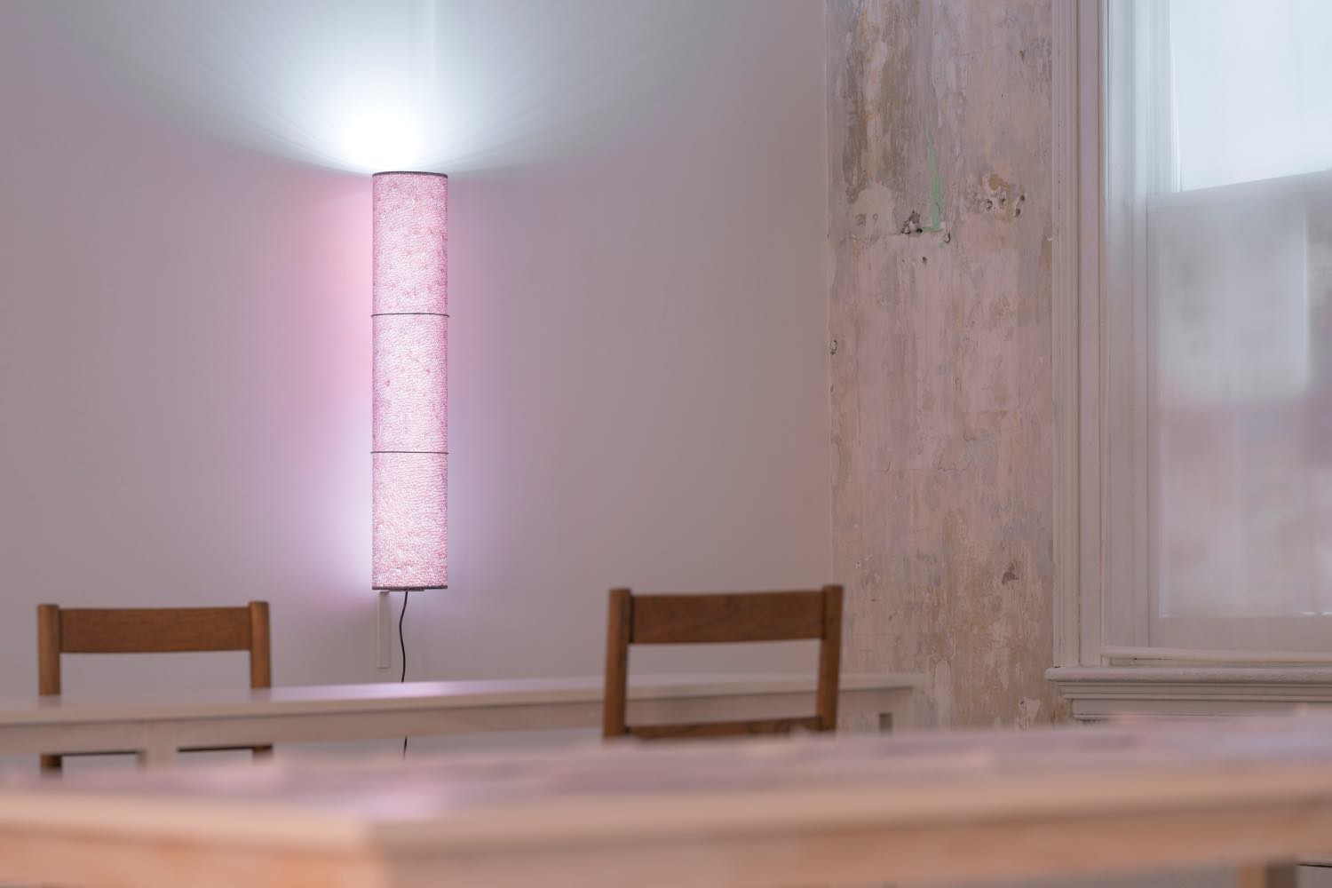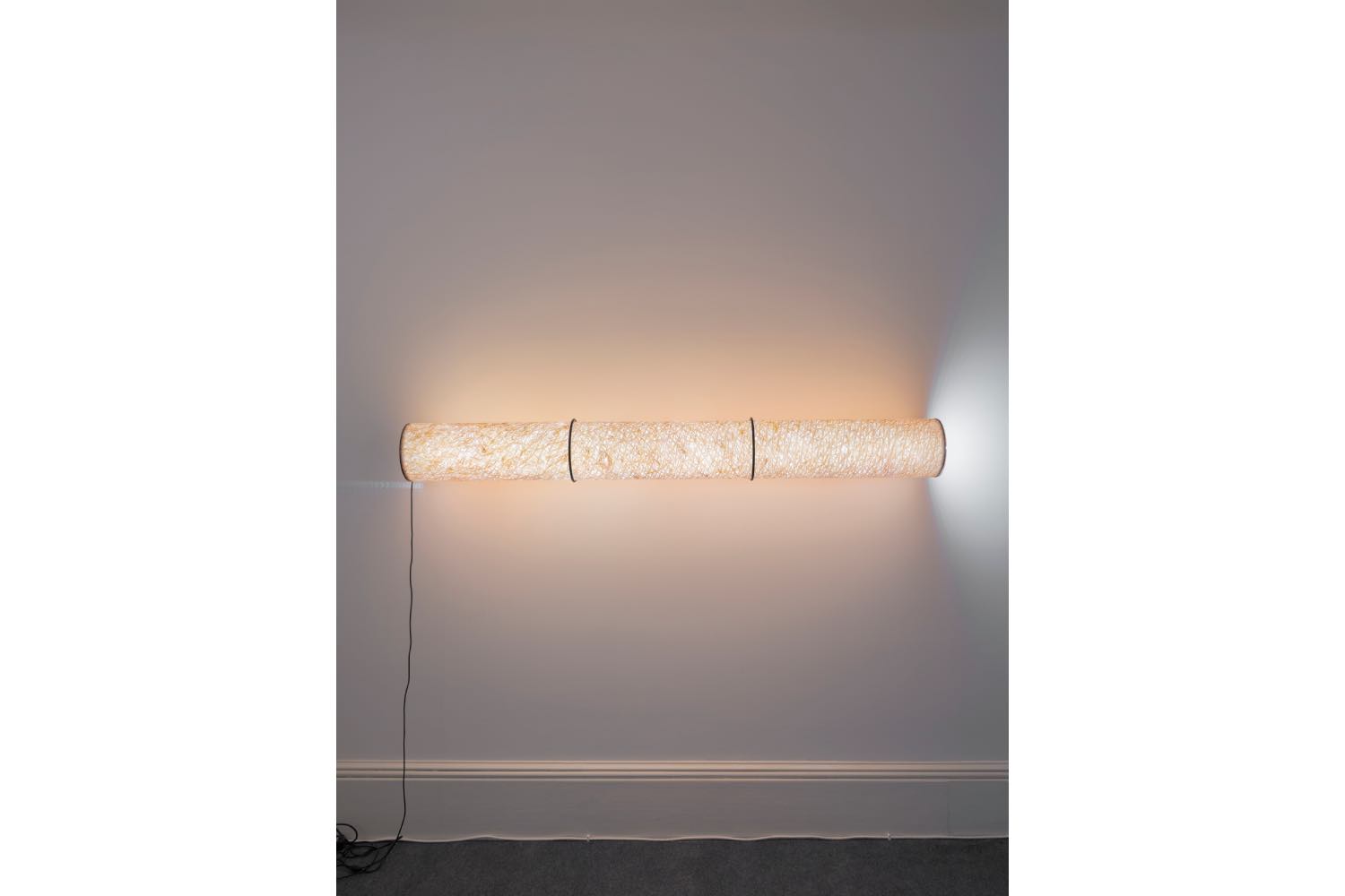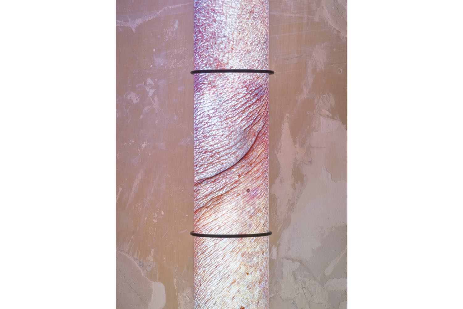 Which brings us back to the installation: to the room with the tables, and the past and future texts, and the tea; to the cylindrical lamps that help us see, whose covers depict magnified, high-resolution photos of human skin. What do we make of all this? Perhaps, like the recent additions to the video, we can consider it something of a diary, a mapping of time, a recognition of the natural. The texts are too many and too long to be associated one-to-one with the video. Instead, they become signifiers. Written work aggregated and redistributed as singular artworks, bootlegged for a new purpose. On one table, the past, on the next, the future. And the third table… the tea… something to be enjoyed… to slow down with. Is that now?
