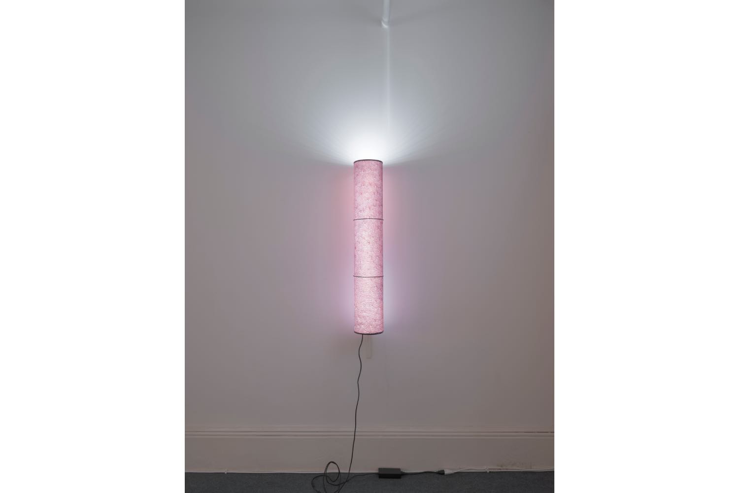 Even then, once (technically) inside Price’s exhibit, there’s still a large penultimate room to decode — three tables arranged with his works. On one, Price’s published texts, mainly bound; on the next, his as-yet-unpublished texts in manuscript form; and on the last, the ingredients and paraphernalia required to make and enjoy a cup of tea. All of it lit by cylindrical lamps enveloped in synthetic fabric printed with scans of human skin.