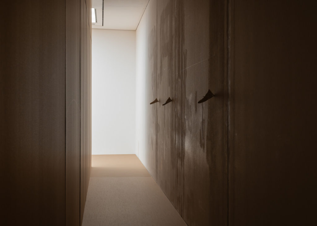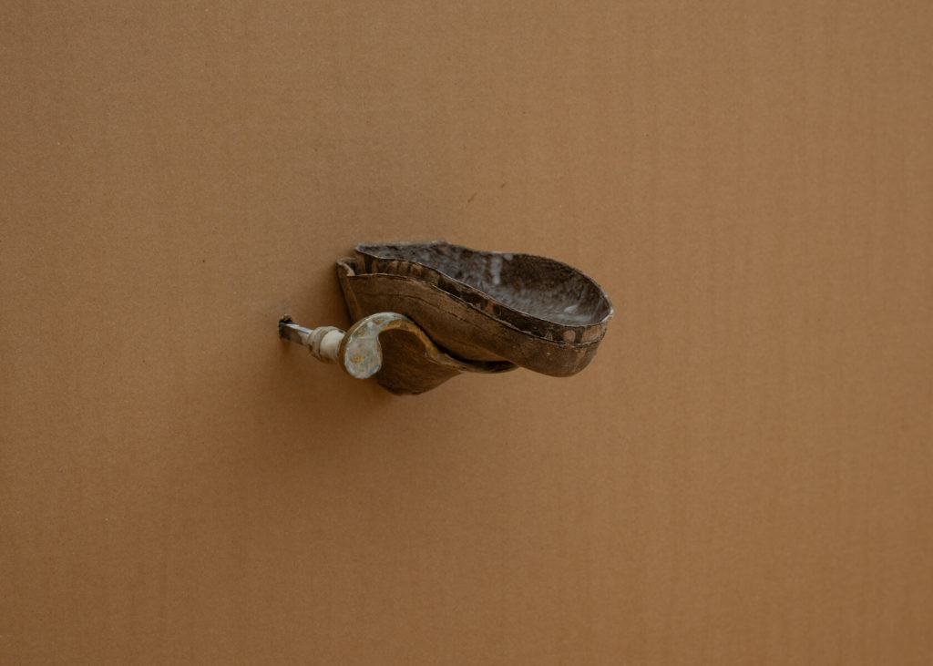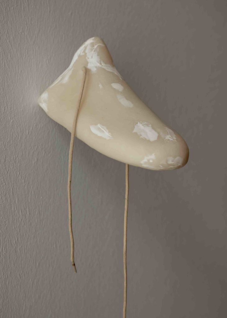 Inside, visitors step into a labyrinth of corrugated cardboard and translucent plastic. The air smells faintly of glue and paper; light filters through veiled off shafts; the softened floor dulls every step. This rather Kafkaesque installation is choreographed through sensation as much as sight: everything yields slightly, as if memory itself were porous. Works appear almost incidentally within this architecture. Sprain (38) (2023) — an antique wooden last fused with a porcelain nose — reads as a surreal portrait from head to toe. The shoe, a recurring motif in Waelder’s practice and personal obsession as a skateboarder, becomes a vessel of motion and memory, imprinted with bodily trace. Nearby, a hidden sculpture — another realistic nose modelled on his father’s tucked into a cardboard box — functions as a near-invisible echo of the outdoor piece, reinforcing the show’s logic of concealment and revelation. Along a dim corridor, Bystander (Ankle/Thread/Right) (2025) presents casts of shoe interiors threaded with laces: hollow forms that make absence tactile, memory manifest as negative space.