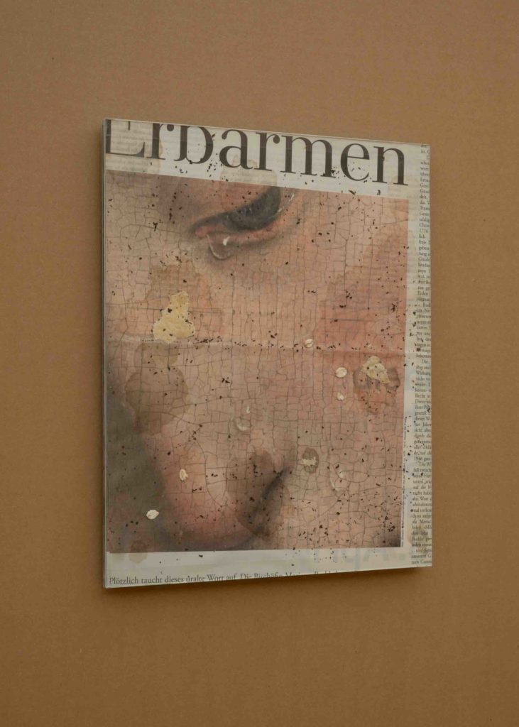 In the main gallery, Mercy (Leak) (2025) isolates a page of the Süddeutsche Zeitung, its headline reading “Erbarmen” (Mercy), stained with tea, butter, and oats — the remnants of the artist’s breakfast. The work grew from Waelder’s daily ritual of collecting newspapers after moving to Germany to work on his language-skills, acting therefore as another kind of corporeal, “stained” record. Suspended above, a constellation of other newspaper clippings filters the light, interspersed with black-and-white film stills of anonymous children playing hide and seek. The installation generates a diffuse atmosphere of pseudo-nostalgia that, through its investment in the minor archive, spectral imagery, and deliberate nonspecificity, aligns with the exhibition’s broader methodology. Yet this affective register remains somewhat disembodied; I found myself wishing for a more situated, corporeal link — an elliptical thread binding these fragments more directly to the exhibition’s other works.