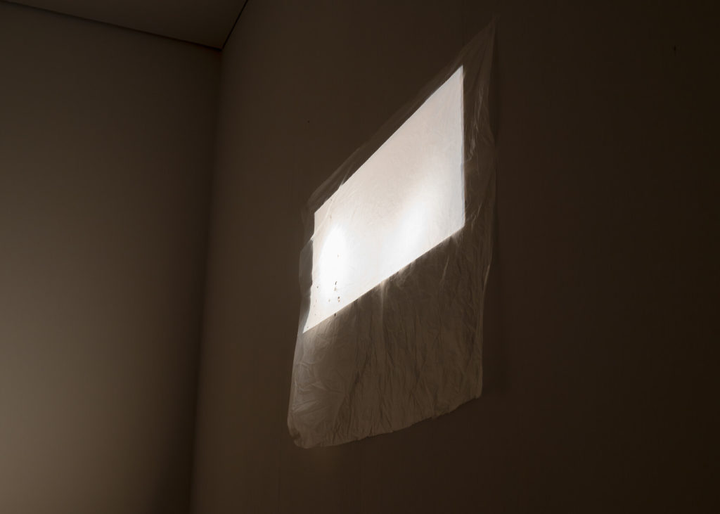 Upstairs, along the café wall, Background Vehicle (Running Scene) (2025) reworks three plotter-printed canvases that layer the same film stills of playing children, this time isolating a single boy mid-run. In the original footage, an Opel Olympia appears in the background — an image that became central to Waelder’s research, given that the same model was once owned by his grandfather and sold in 1939 to finance his escape from Germany. Across these canvases, however, the car has been deliberately cropped out. Its erasure becomes the work’s ghostly anchor, transforming absence and the “negative body” once again into subject. Each canvas is coated with raw linen, glue, oil, and filler; from the side, only stains and shadows are perceptible, while from the front, the child’s figure re-emerges. The oscillation between opacity and legibility mirrors memory’s instability — and, by extension, Waelder’s self-reflexive method, where each repetition of a motif subtracts a little more information, allowing history to surface as “after-images”[1] — psychic and material traces through which the past continues to register affectively in the present.