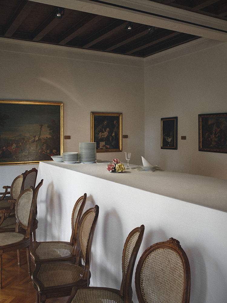 Andrea Faraguna: The idea behind the set design was to turn the museum into the illusion of a bourgeois residence. This staging began from the very first moment of the evening: all the guests entered through the service door, and many didn’t immediately understand where they were. We added only furniture and carefully selected props, just the right number of elements to suggest a cinematic narrative without transforming the space or making it hyper-realistic. The furniture evoked a multigenerational, familiar taste shaped between the 1980s and the early 2000s.