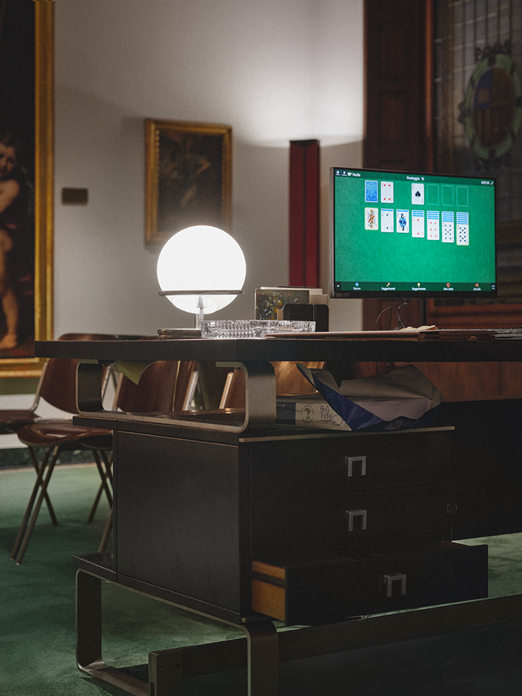 AF: Exactly. On the one hand, it was inspired by the museum’s sleepy atmosphere — it’s not one of the most visited places in Milan. On the other hand, solitaire is somewhat emblematic because the introduction of technological elements from different eras gives it a sense of historical indefiniteness: whether it is ten or twenty years ago or today, it could be today, but it is somehow suspended between these periods, without settling into a precise historical footing.