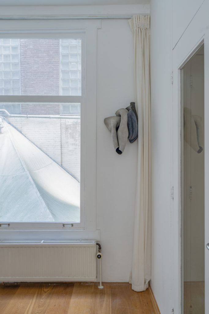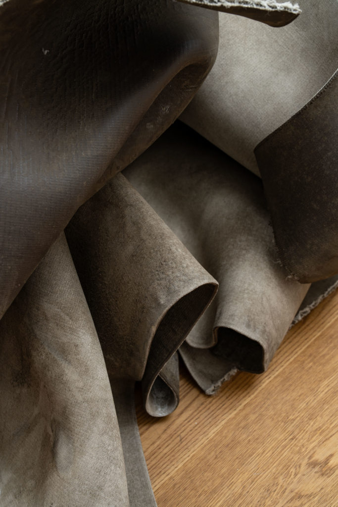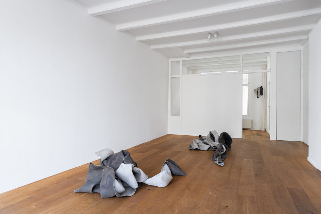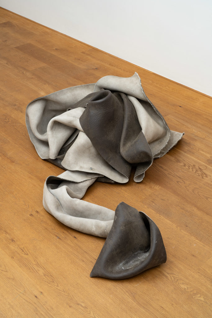 “A fetish is an erotically endowed object that someone can possess and control; yet, paradoxically, the fetish seems to control or possess the person who thinks she possesses it.[1]” This misrecognition lies at the heart of the exhibition’s central question. Céline Mathieu writes in the accompanying text that the verb “to construct” makes her think of co-poesis, “of things becoming in through and in relation to each other. A wet solidifying. As most of us are bodies, relations, histories. Yet these sculptures look like they are forever foldable, their potential movement inherent, and the moment they reach full absorbing potential, they become obsolete, sealing water out.”[2] This inversion echoes the dynamics of desire and fetish at the core of Aurrekoetxea’s practice. It becomes a starting point for developing a new inter-relationality between the artist and the viewer, prompting continual re-engagement with one’s assumptions and shifting interpretations with each work encountered.