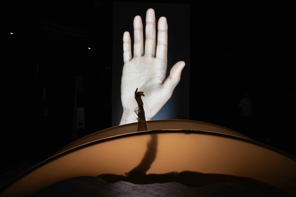 Spores evolved under practical constraints — space, logistics, exhibition conditions — that transformed an installation with live elements into a durational performance. The collaboration with Operomanija emphasized its musical dimension, aligning the structure with a model inspired by Greek tragedy: a protagonist undergoes therapeutic sessions with an AI whose script regenerates with each iteration, accompanied by a chorus of non-professional singers selected through an open call. The work interlaces body, voice, technology, and collectivity, imagining modes of care beyond Western therapeutic paradigms. For Pakui Hardware, relationality is central: “building bonds between people is as important as the singing itself; the process matters more than the outcome.” The AI becomes a “technological mirror,” reflecting and distorting the protagonist’s emotions and generating a transformation affecting both her and the chorus in a shared process of resonance.