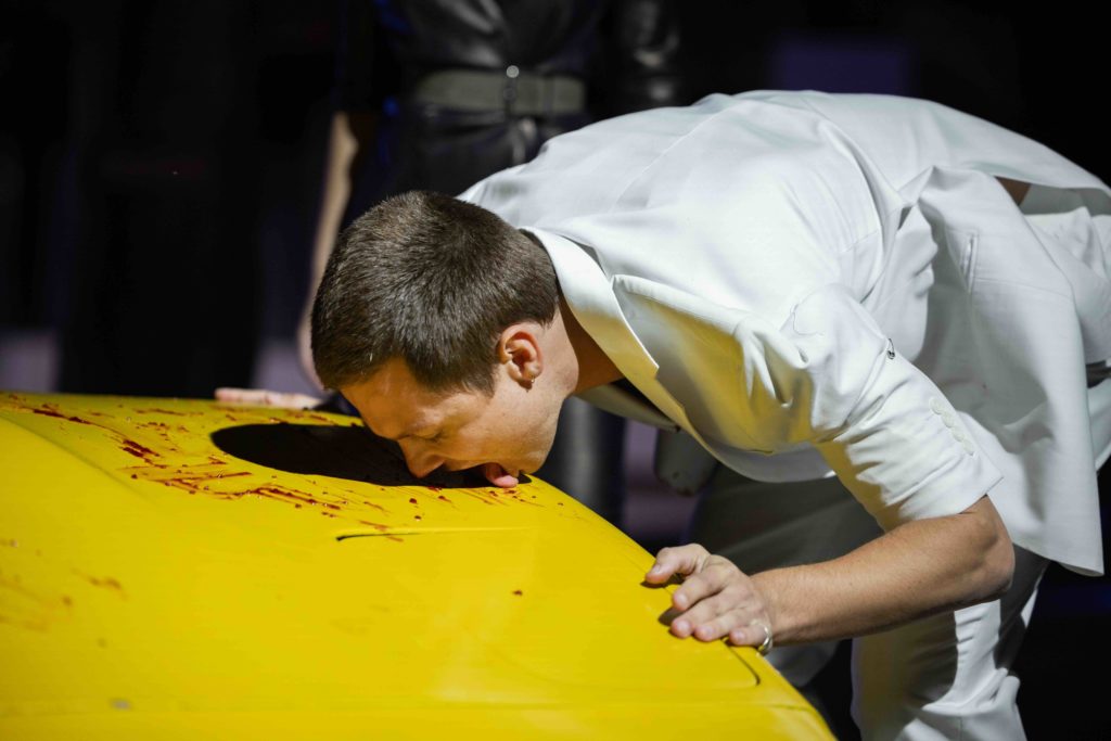 Space itself acts as an aesthetic agent, shaping perception and linking personal experience to the overall “temperature” of the performance. Sylvie Fleury’s Instructions for Twilight exemplifies this: her performance reassembles historical gestures into a living score. Set among dissected cars and reflective surfaces, Fleury revisits iconic reversals of gendered and consumerist codes — from walking on Carl Andre’s floor pieces to inverting Allan Kaprow’s Women Licking Jam off a Car. References to Fluxus and Happenings become a grammar rewritten through a feminist lens, while JG Thirlwell’s live sound amplifies footsteps, frictions, and subtle movements, turning sound into the performance’s driving force.