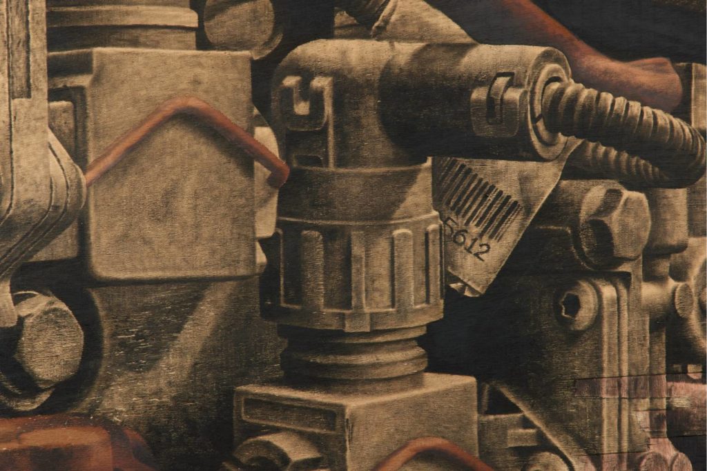 JO:For me, plywood is an interesting material. I use it as the resting place for my interpretations. When you think about the origins of the substances and minerals we use to produce machines, they were once organic, before human intervention rendered them inorganic. Placing them on an organic substrate completes a loop between the organic and the inorganic. And when I study machine parts, I often observe organic shapes and forms in them — an organic logic hidden within mechanical design. Plywood also responds beautifully to the colors I make from dissolved metals and acids; it absorbs them. I also enjoy plywood’s layered structure. I can paint not only on the surface but within the layers. Some works have the first and second layers peeled away so the image sits inside the material. As an organic material deeply tied to global industrialization, plywood becomes a commentary on how transformation and industry affect the resources we extract from the earth — especially now, with rising wood prices and deforestation. It’s a kind of sweet spot for me. Most of my paintings are on it, though not all. I try to create works that are both organic and inorganic, influenced by my training as a painter and sculptor.