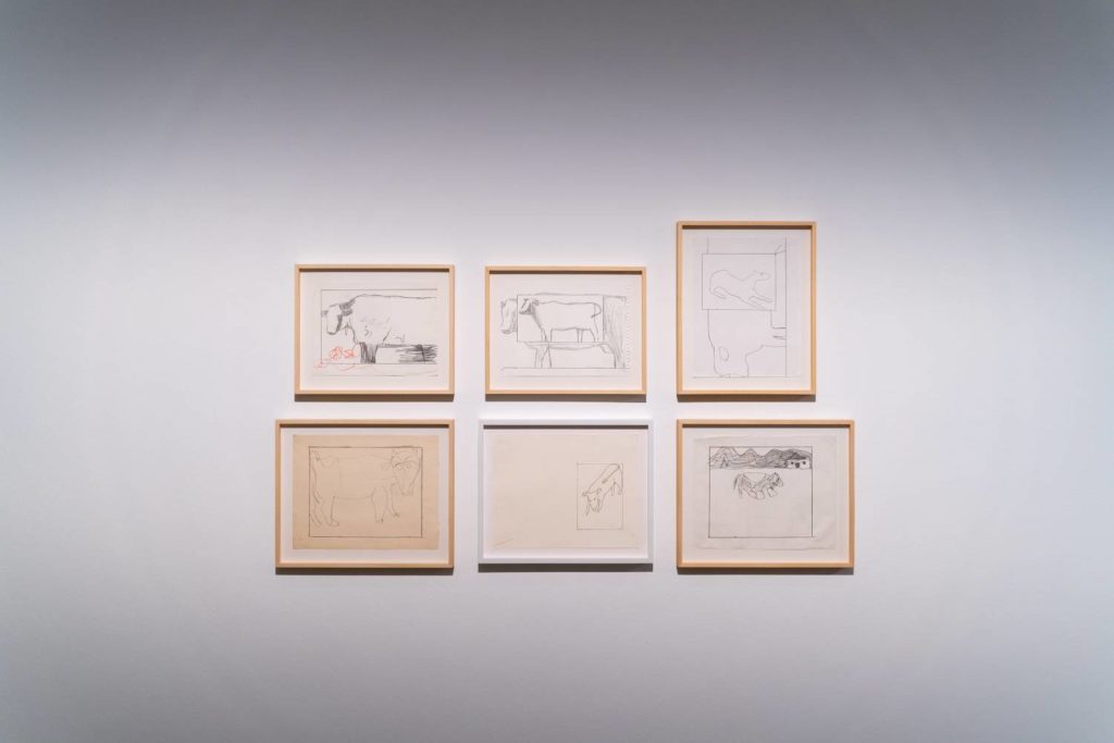 The friskily unrestrained character of Bradley’s new canvases can be partially traced back to his long-running passion for the world of comics and cartoons. This becomes evident when looking at his drawings, which alternate between childlike doodles and more tentatively refined sketches. While Bradley’s references range go from pop culture to art history, his works on paper share the speed and roughness of quick thinking. As he noted in a recent interview for émergent magazine, his drawings are always ahead of his paintings, leaving the latter to chase the spontaneity of the former. This search for immediacy, if not for vulnerability, is at the core of Bradley’s latest family of works. At the same time, his new canvases show a carefulness and attention to detail that was missing from his earlier production. The aloofness and irony of his artistic beginnings seem to have shifted toward a more expressive, straightforward approach to painting. In the aforementioned interview, Bradley admits that he’s now “happy to cop to that, to authorship or whatever.”