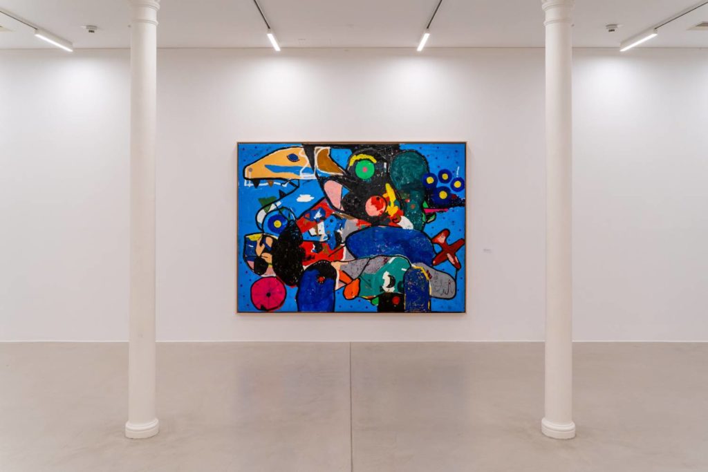 While the exhibition — Bradley’s first institutional show in Austria — is presented as a retrospective, a good part of the roughly ninety pieces gathered for the occasion originate from the last five years. As such, what emerges is less of a long-term perspective on the artist’s varied digressions than a snapshot of his most recent work. The older works frame the new chapter as something that has been a long time coming — a change brewing under the skin of Bradley’s canvases before finding an opportunity to emerge. This curatorial choice is reflected by the exhibition’s chronological route: the result is a tidy, at times rigid, narrative, presenting Bradley’s art as evolving in a largely linear fashion. The first room’s Abstract Expressionist–inspired blotches of color develop contours in the second, as figures begin to emerge and the brushwork grows more minute and refined. Bradley’s abstract forms then condense into equally bright and impactful characters –– such as Dum Dum (2025), a totemic figure with vermilion skin and zigzag legs. Still, to call his latest work fully figurative would be a stretch, as the canvases seem to constantly be on the brink of falling back into chaos. In Good Work (2025), for example, a dog’s snout and a gaping eye hover above a cluster of color fields and lines, equally chimeric and carnivalesque. It’s a playful, eerie mess.