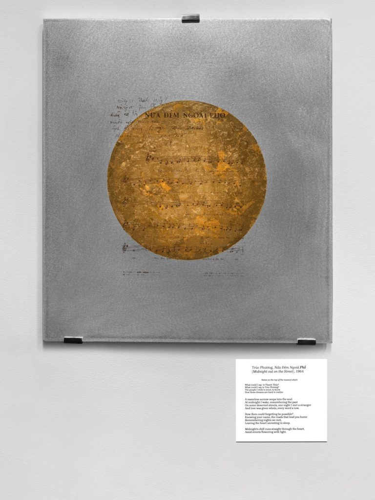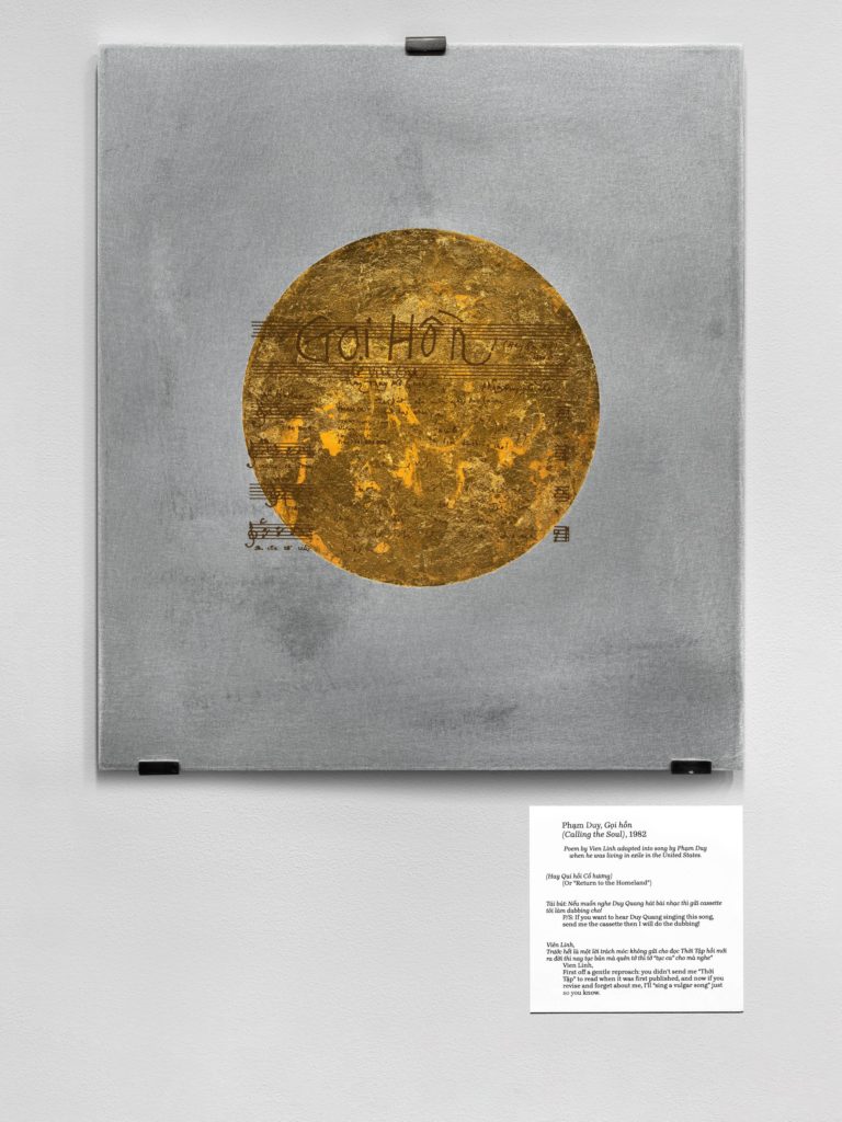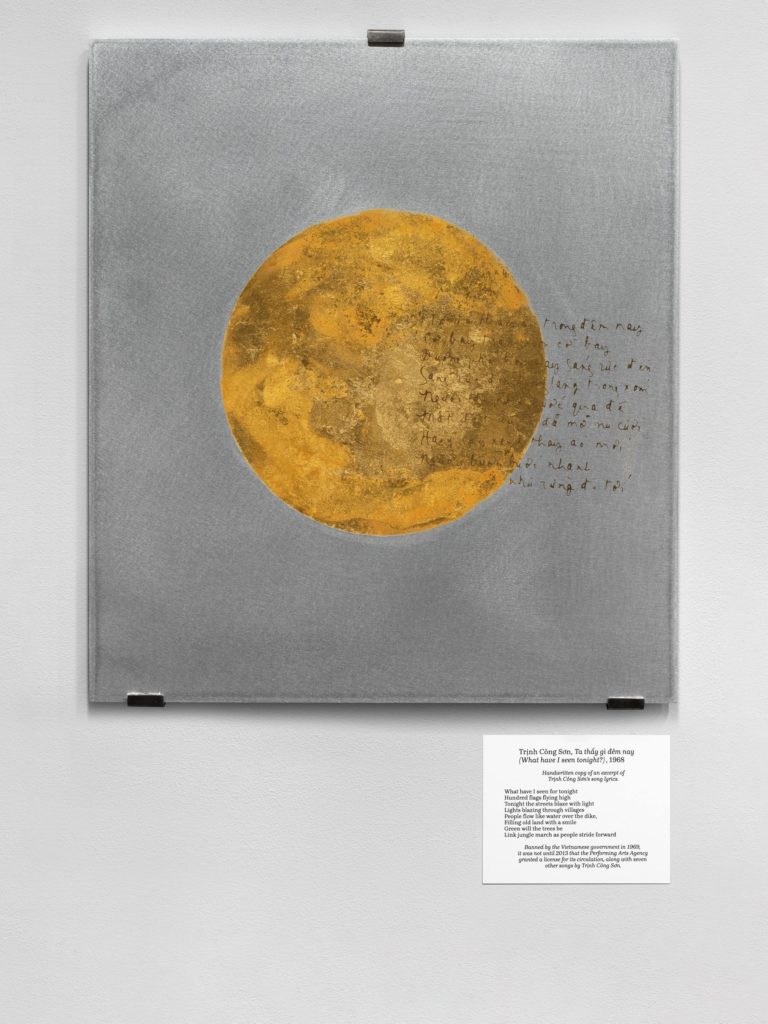 Much like the contraband home videos in Aisle 9, bolero’s inclusion in Perforation, Ellipse represents both the fragility of memory and its enduring strength against total erasure. Installed throughout the Storefront space among the configuration of screens are six aluminum plates, titled Ellipse 1–6 (all 2026). Each panel features a single, centered gold circle and an overlay of scrawling handwritten text featuring the lyrics of previously banned bolero songs, some of which, such as Ellipse 2’s “Han Mac Du” by Pham Duy, are heard in the video. In the corresponding wall labels, Nguyen includes English translations of the Vietnamese lyrics, notes from the musicians, and, in some cases, accounts of the consequences faced by bolero musicians who performed these songs.