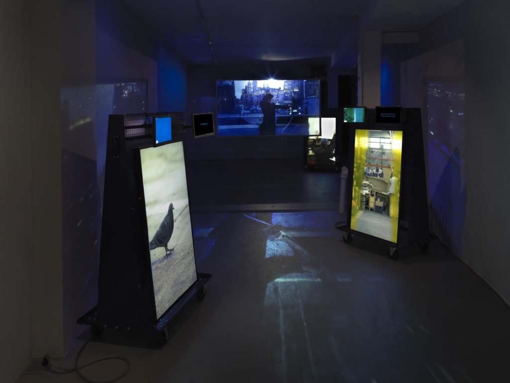 Bathed in blue light, Storefront’s street-level gallery presents Perforation, Ellipse across nine screens of various sizes, eight of which are grouped together on tall, rectangular plinths that allow the viewer to see multiple scenes at once. The ninth — and largest — screen is situated near the center of the gallery and is suspended in mid-air. It shows looping footage of Nguyen with a bow and arrow, shooting toward an off-screen target that, in its absence, suggests a slippage or interruption in linear time. The videos on the plinths weave together narrative and non-narrative sequences, including internet videos, abstract fields of color on film strips, and the aforementioned quotes from In Praise of Conspiracy Theory. The narrative portion of Perforation, Ellipse is constructed from scenes from Nguyen’s short film Aisle 9 (2026), a work of speculative science fiction set in a nondescript warehouse. Aisle 9 presents a near future undone by censorship, represented here by the warehouse’s clandestine function as a repository for home videos, films, and recordings seized by a government contractor. The warehouse’s workers, who unknowingly discover this cache of forbidden material, turn the storage facility into a local cinema, screening the videos in secret.