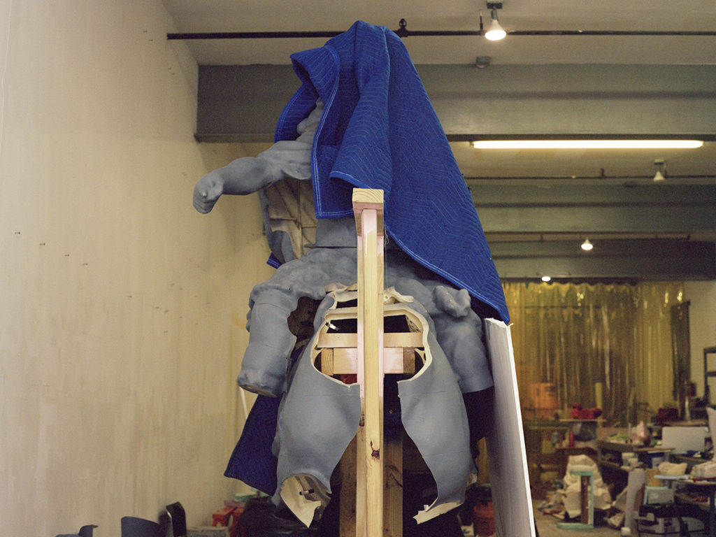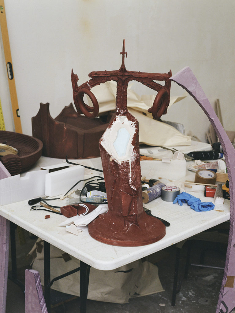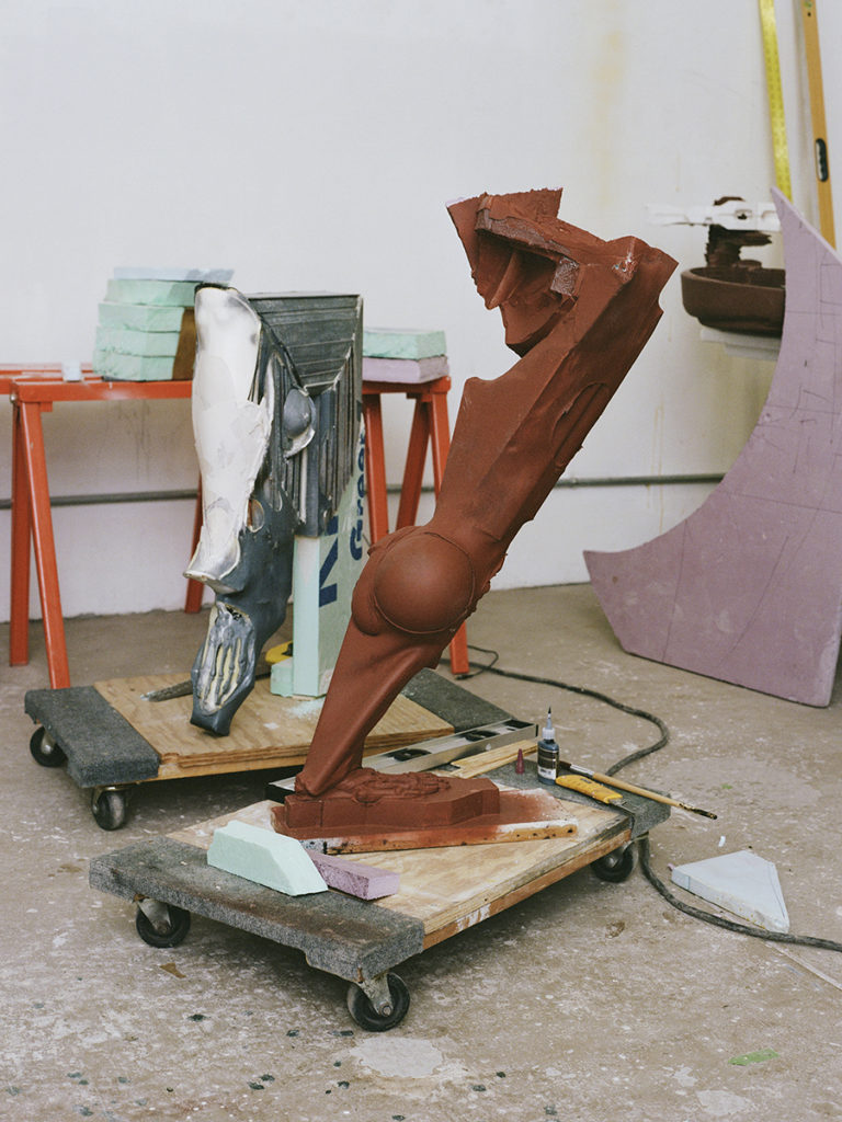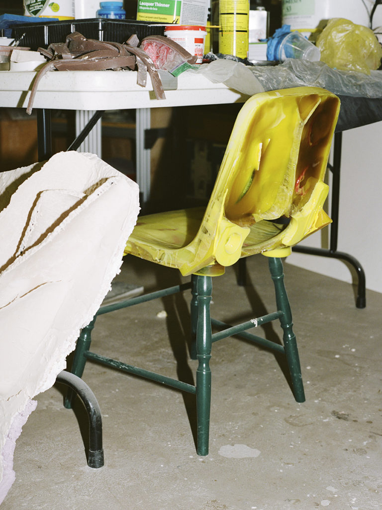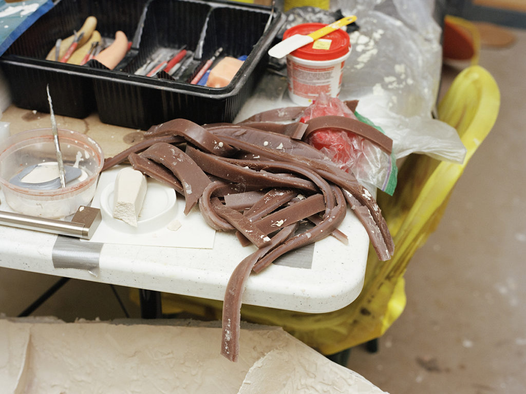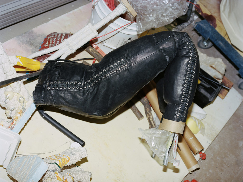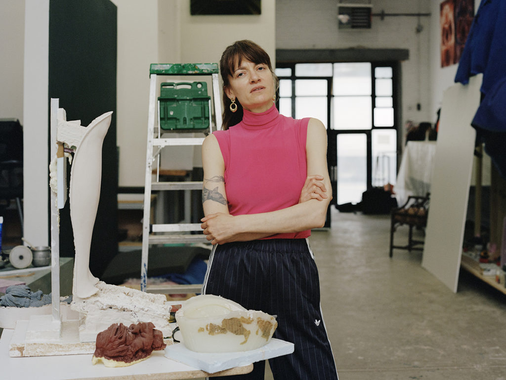 The eviscerations of death and violence have always built a lairage aside Ursuța’s art, but also her life. (It’s no coincidence the word “rage” haunts lairage, the adjacent waiting room prior to slaughter.) Growing up, her family would butcher a pig every year, making meat products or soap from the bones, using every part of the creature: femur, pettitoes, ears, snouts, liver, and heart. The fate of the animal. And perhaps it is simply this — the fate of the animal — that offers a loose-threaded ligature through her work, bleak and humorous, playful, cartoonish, melancholic as hell. In essence: muscle memory. Frankness and seriousness are monumental in the artist’s shows, but she’s also hysterical. Hoisting sardonic wit in “Alps” at the New Museum, New York, in 2016, she installed a vertical free-climbing wall, yet rather than neutrally shaped anchors, there are colorful resin dicks of all sizes,
