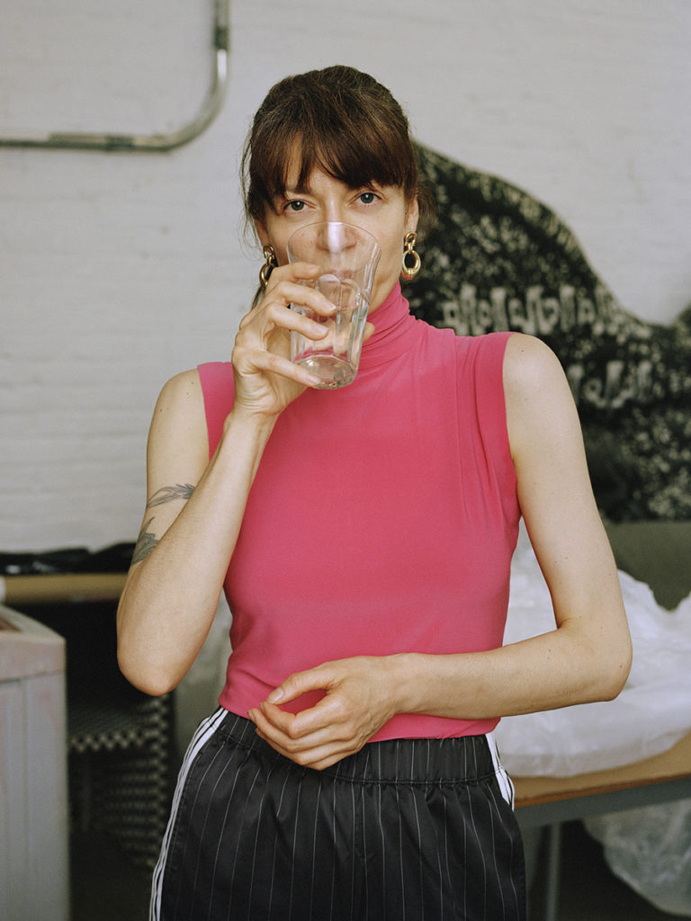 ziggzagging down. Put simply: dicks everywhere (business as usual). Sport and men have a great deal in common: imposing restrictions, rules, foul odor, exhaustion, hierarchies, and torture, and here the artist marks the mountainous territory of painstaking triumph. It takes all our slippery athleticism to crawl over the patriarchy, to latch on and stay latched in upwards mobility, to conquer the phallic handles that exist to oppress. All of this, mind you, without a safety net. In a way, Ursuța, insolent and brazen, floats jocularity as a safety net, happy to castrate dominant society, slitting patriarchy ear to ear while grinning ear to ear. Then again, why give more space to penises than absolutely necessary; would it not be more “feminist” to model vulvas as a signifier of triumph? Is she writhing against patriarchy? Not really. And that’s precisely how Ursuța wants it. She is, in fact, occupying new territory, which is to demonstrate the environmental influences affecting subjective projections of misogyny, patriotism, capital, and melancholy, and thus colonizing discourse in her own subversive way.