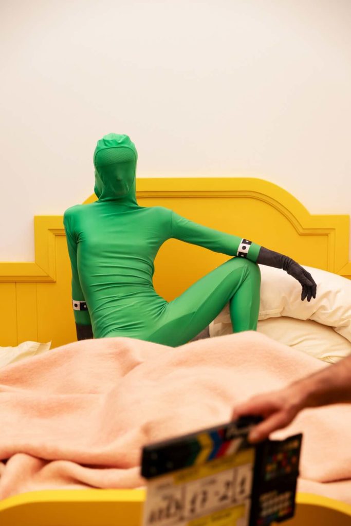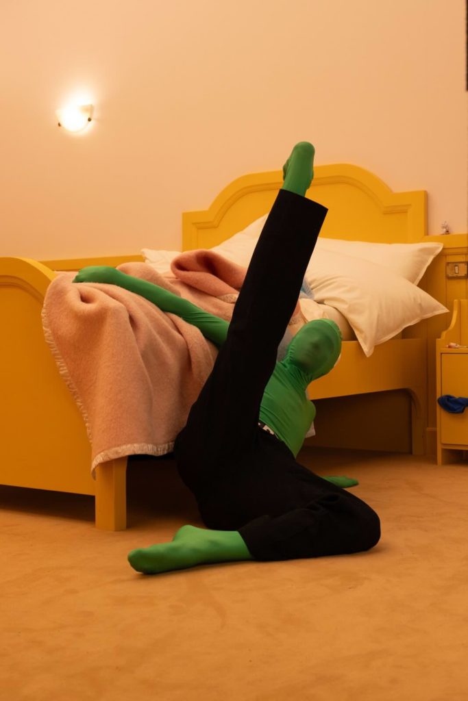 Or we might find its twisted, magical, beautiful logic in Marcon’s most recent film, Krapfen (2025), in which an androgynous kid (played by a preternaturally youthful looking performer) is harassed, plagued, prodded, some might say tortured, by a team of flying clothes: trousers, gloves, a foulard, a pullover with a collared shirt underneath, who demand to know why they do not wish to eat their formerly favorite treat, an apricot-filled donut called a krapfen, a traditional Austrian delicacy. The kid resists, runs around the yellow room, is forced into cavorting dances with the clothes who — though bodiless — possess voices that hector, as in Marcon’s other films, in delicious and beautifully scripted song. (The musician and composer Federico Chiari is Marcon’s frequent collaborator.) The kid ends up hiding in the closet, where the voices continue, demanding to know why their childhood delight has been forsaken.