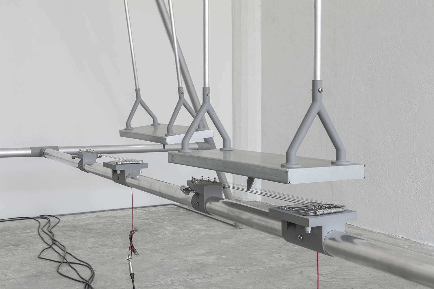 Fabro’s intervention tends to be light, subtle, as in the metallic rods he uses in an attempt to lighten space and render it clear. In Sonsbeeck’s La doppia faccia del cielo (1986), a huge heavy stone similar to the enlargement of a primitive tool of the Stone Age, is suspended, supported by a net, like a fish caught at sea. Similarly, his heavy marble or glass feet are rendered light both by the material’s transparency and the softness of the silk columns which link them to the ceiling, as if they were huge prehistoric animals’ legs gently taken down to the ground from the sky.