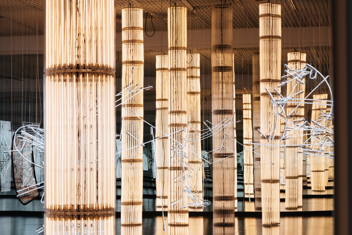 The serial neon works — from Neon Forms (after Noh I-II) (2015–ongoing) to Neon Forms (after Noh V-XII, XIII) (2018–19) — function as scores. Inspired by Kata diagrams, which teach Noh movement patterns, these neon lines are soft extensions of computerized body movements. They perform the space as much as the space performs them. In a techno-animistic manner, the musical props crafted from glass – such as the windshield panels of Phase Shifts (after David Tudor) (2023), emitting Tudor’s sound; the thirty-seven crystal tubes forming Composition for 37 flutes (2018); and the metal gong wrapped in Mylar blankets in Sounding Felix (Paris 8 assemblage) (2022) — activate circular, open-spiral shapes. Evans himself has stated, “On the breeze … the diagram is no longer an auditory or visual archive but a map or instruction, a cartography that is coextensive with a social field… It is an abstract machine between dimensions.”