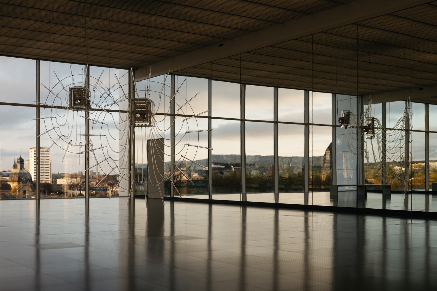 Cerith Wyn Evans has created a time-based installation that transforms Centre Pompidou-Metz into a vessel for experiencing “borrowed lights” across a series of vibrant material encounters. Engaging in dialogue with the museum’s architecture, the project begins in the large entrance lobby with a winter garden, an echo of Marcel Broodthaers’s Un Jardin d’Hiver (1974). Here, however, the palm trees become bonsais, a magnolia, and a pear tree, all placed on a slowly rotating base. Arranged diagonally at varying heights and juxtaposed on wooden pallets like commodities, these elements are sourced from local nurseries or transported from South America – like the massive amethyst geodes encased in glass crates. This first, Interlude (Borrowed Landscape) I (2014), recontextualizes and sets the stage.