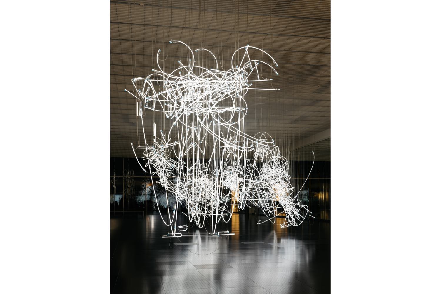 At its center, two cylindrical neon columns from S=U=P=E=R=S=T=R=U=C=T=U=R=E (2010) stand switched off, caught in a latent stage of obsolescence. Stripped back to their material essence, they appear as giant lamps in a petrified garden. Above, a translucent suspended skeleton, What of it? (2024), gleams with acetate bones, performing a macabre dance alongside its projected double swaying on the wall.