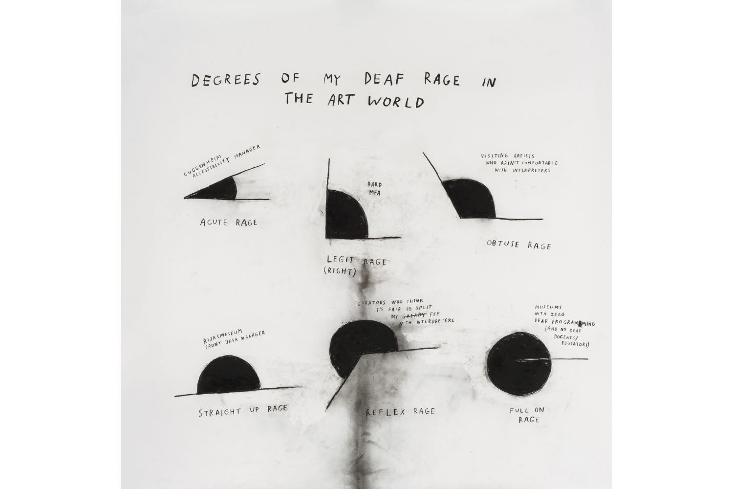 OP: Your MoMA experience makes me think of your Degrees of My Deaf Rage in the Artworld (2018) drawings. Like the rest of the “Deaf Rage” works from that year, and the trauma drawings series from 2020, they combine the sensibility and humor of the cartoonist—that organic, animate line in your graphs and pie charts—with real anger. They deal with emotions that might be characterized as negative or isolating, but are so, so funny. How do you think about the role of humor in your work?