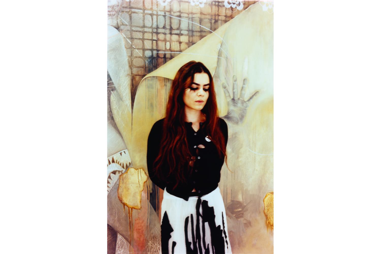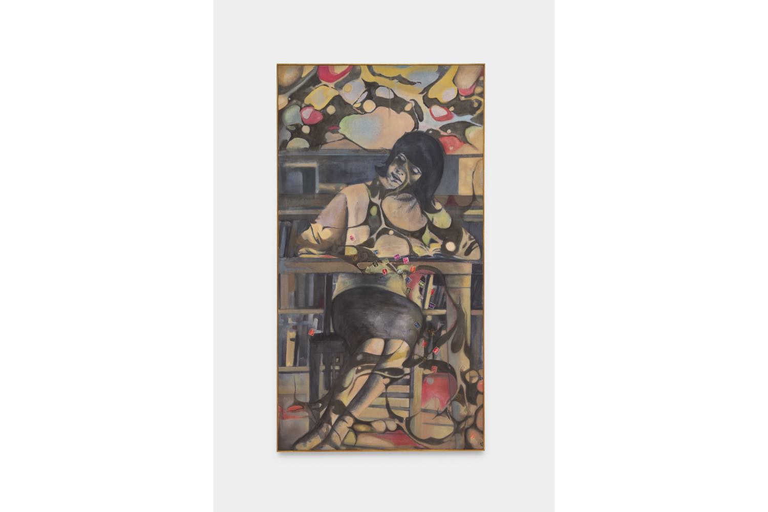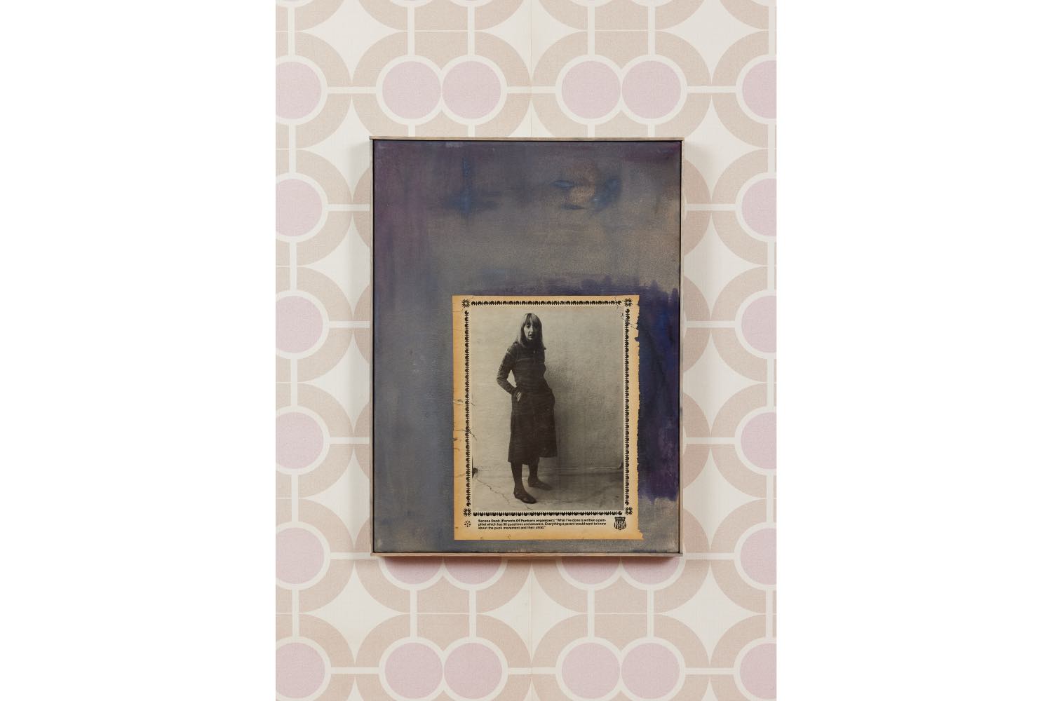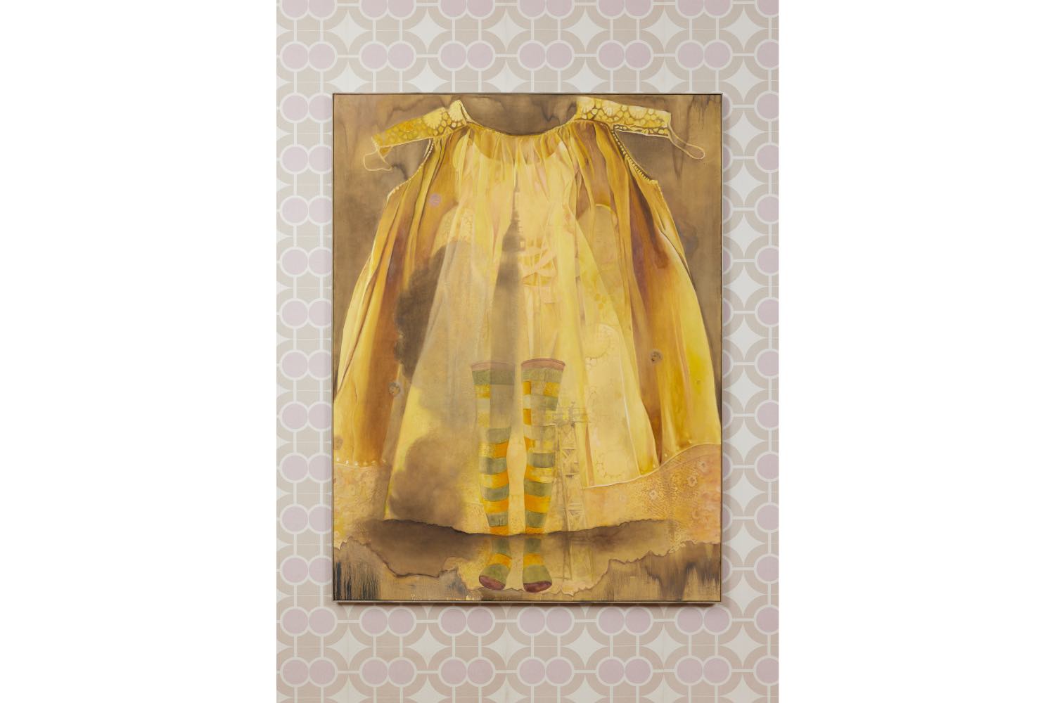 In “1st Edition,” her exhibition at Ginny on Frederick, London, in 2024, Metcalf folded in her previous explorations of madness with all the angst of a rebellious teenage girl coming of age and seeking her independence. Staged across time-periods — the Victorian Gothic, 1960s to ’70s counterculture, and today’s maladjusted teen crisis — the effect was a meditation on the notion of cyclical time, where progress is nonlinear and moral panic continually resurfaces. Densely patterned 1960s wallpaper covered the gallery, which spilled over into the paintings in different iterations. There, the figure of the adolescent girl is evoked through her clothing: from her striped socks to Harry Gordon’s popular “poster dresses” from the 1960s, she is trying to form a sense of self through layers upon layers of suffocating domesticity. The wallpaper in the paintings is torn and weeping, mining the same psychic terror of “The Yellow Wallpaper.”