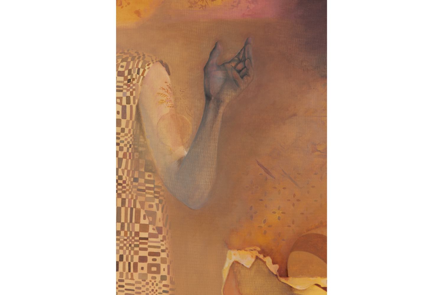 The paintings have a similar procedural proficiency. The figure-ground relationship in Metcalf’s paintings is frequently muddled as she creates layers of paint that appear transient. This allows her objects and figures to appear ghostlike — like memories that fade in and out of the mind’s eye — providing them with their particular etherealness. The use of sponges to rub and pull at the paint and the scratching into the surface with clay tools or a palette knife, alongside other techniques – frottage, decoupage, stenciling – all help her achieve this. Her command of color is particularly skilled, and she frequently uses the various tonalities of a single color across a picture in order to evoke a greater cosmic quality. In this sense, many of Metcalf’s paintings can be read as studies on the tones of her chosen palette. In The Etiquette of ….. (2025), for example, the color yellow is applied in hues from gold to a smudged green. The effect is that all details are caught between the surface and the background. The two girls (who form the work’s subject) are depicted as half-formed impressions — both there and not — suspended between emotional release and its suppression.