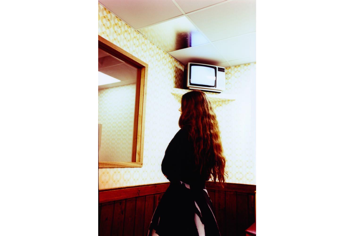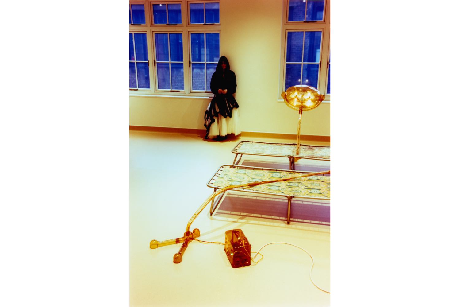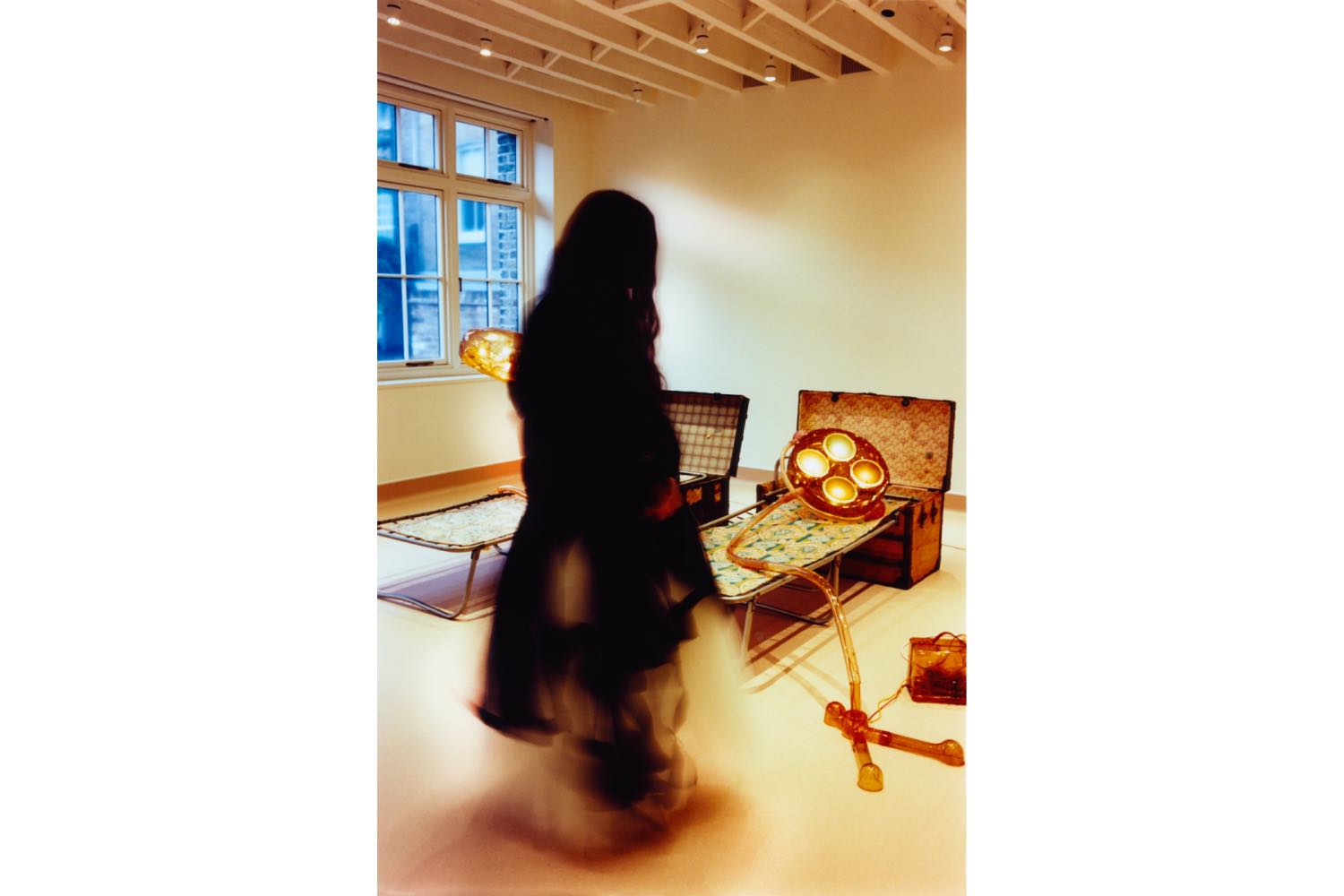 In her current exhibition, “Gaaaaaaasp,” at The Perimeter in London, Metcalf has created her own imagined version of London’s infamous asylum, Bedlam (Bethlam Hospital). There, the constant muffled threat of being pathologized is taken to the next level as care becomes fully institutionalized. There is a surgical theater (think procedures like lobotomies, craniectomies, and electroconvulsive therapy); a wallpapered waiting room where a television plays Cam 2017/2018 (2025), a silent black-and-white video diary of Metcalf’s own therapy sessions; and through the examination window, we see a field of canes with protruding pregnant bellies. The patients found in the theater are symbolized as mobile surgical lamps consistent with 1960s design, but here are replicated by the artist in vacuum-formed plastic, hand-dyed a copper color. The hospital beds are composed of found 1960s sun loungers that are attached to antique trunks used by the military in the 1880s to transport camp-beds. The decision to construct these “figures” in plastic emerged from Metcalf’s research into Lee Bontecou’s lesser-known, but nonetheless exceptional, 1960s plastic flower sculptures. The material is an apt choice, rendering them as ghosts — perhaps left behind after the mass deinstitutionalization that occurred in the 1960s, following the growth of the antipsychiatry movement. As with all of Metcalf’s work that disrupts temporal logics, histories of care collapse in on one another here. Her aesthetics may reflect the past, but they hold a mirror to the crisis in care and mental health that is currently unfolding: the post-COVID fallout for teenagers and young people, the damaging effects of social media and cyberbullying and the failing healthcare systems following years of austerity.