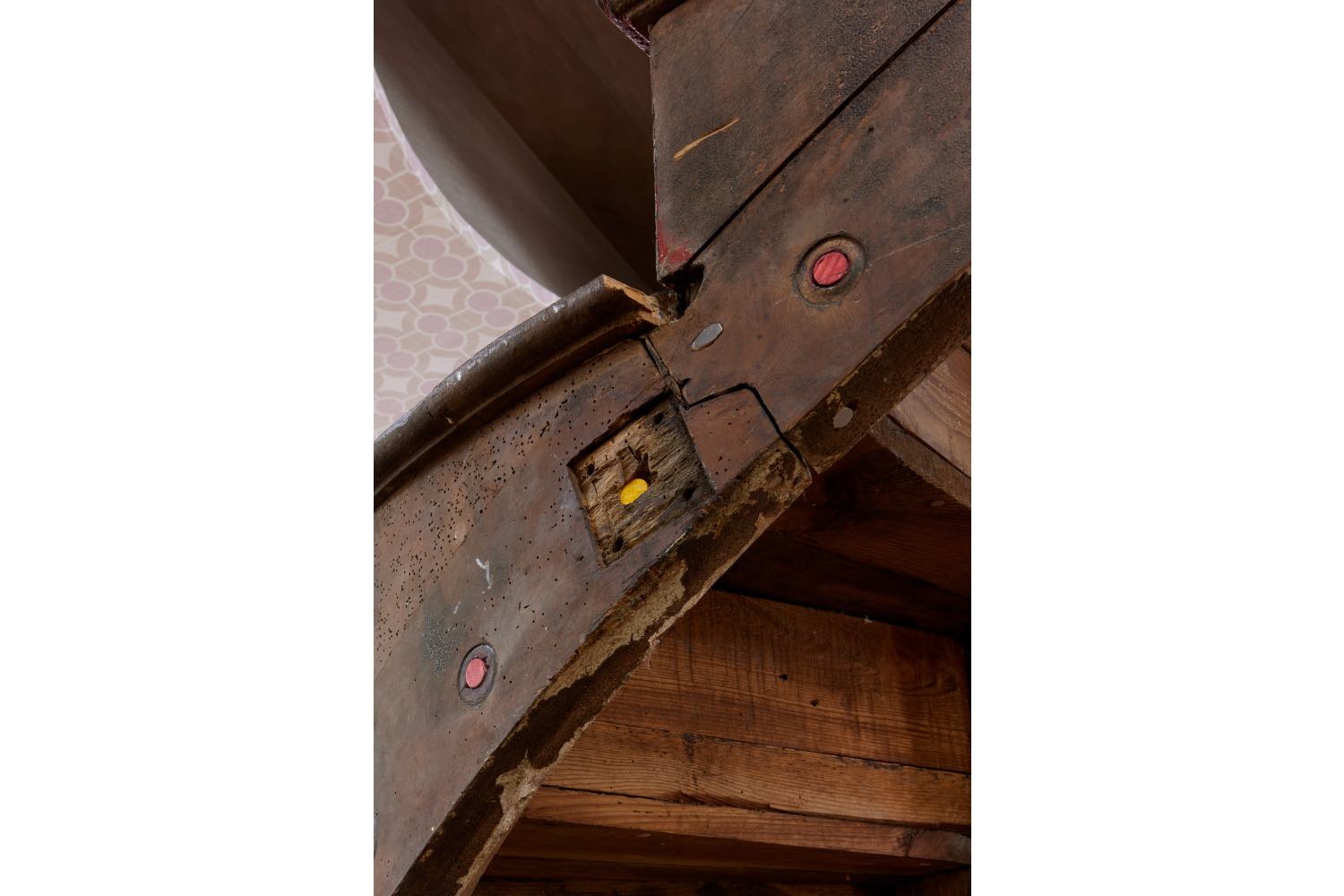 In Silent Forms of Interspecies Panic (2024), Maria Callas’s disembodied head appears once more among the layers of clothing. As Metcalf’s recurrent personal trope for drama, Callas is both the anxious, emotional teenager and the despairing, panicked mother steeped in her patriarchal moral conditioning and containment. The theatrical centerpiece of the exhibition was The Mind is Maya (2024), an imposing wooden spiral staircase that ascended toward a dark hole in the ceiling. As with many of Metcalf’s sculptures, the staircase is anthropomorphic, transformed into the archetypal Gothic madwoman in the attic, spiraling out of control. It stood like a satirical klaxon — a loud, ironic signal of how the artist’s work straddles horror and humor. If everything seems a little over the top or unhinged, I think this was the point.