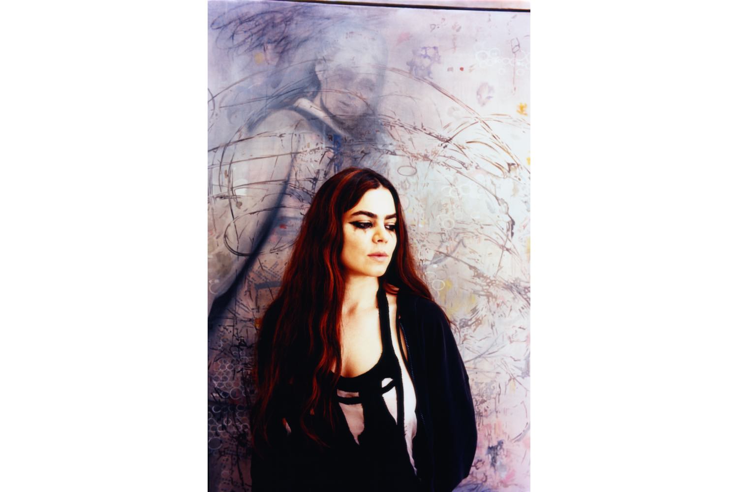 In The Rest Cure (2024), the descent to diagnosis is mythologized by Metcalf. Here, the ghost-like silhouette of a woman’s body lies in the foreground of an eerie, purple-bruised landscape. The body is either obscured or more likely being consumed by what appears to be a skeleton that is slowly decaying at the very forefront of the picture plane. The sky is atmospheric and full of images of the famous opera singer Maria Callas’s head. Replicated both as spectral white stencils and tiny black-and-white photographs decoupaged onto the painting, Callas is mostly shown mid-aria — the very aura of drama, or perhaps more directly, a symbol of a shrieking woman. As with much of Metcalf’s work, this painting is content rich, but its title is perhaps one of her most direct: the “rest cure” was a nineteenth-century treatment, invented by the neurologist Silas Weir Mitchell, for female hysteria and other nervous conditions. It involved prolonged bed rest in isolation from family and friends, being force fed a fat-rich diet (think milk and red meat), the denial of any real mental stimulation, and electrotherapy to activate idle muscles. Charlotte Perkins Gilman was prescribed this remedy, and later wrote the infamous short story “The Yellow Wallpaper” (1892) that sought to challenge the effectiveness of Mitchell’s therapy by recounting a woman’s psychotic breakdown resulting from rest cure. In Metcalf’s telling, if the figure of Callas is taken as emblematic of a woman at the break of psychosis, screaming into the void, then the lying figure shows us her diagnostic fate — a woman who has lost sight of herself, succumbing to the demise of her autonomy.