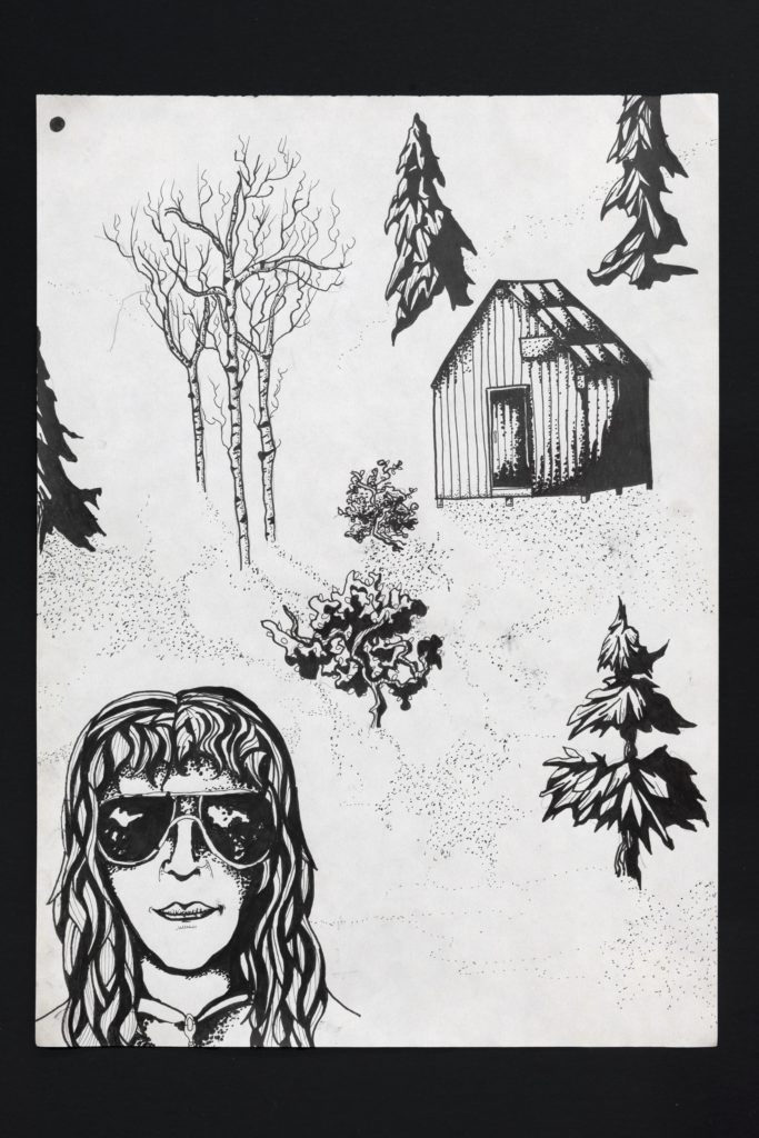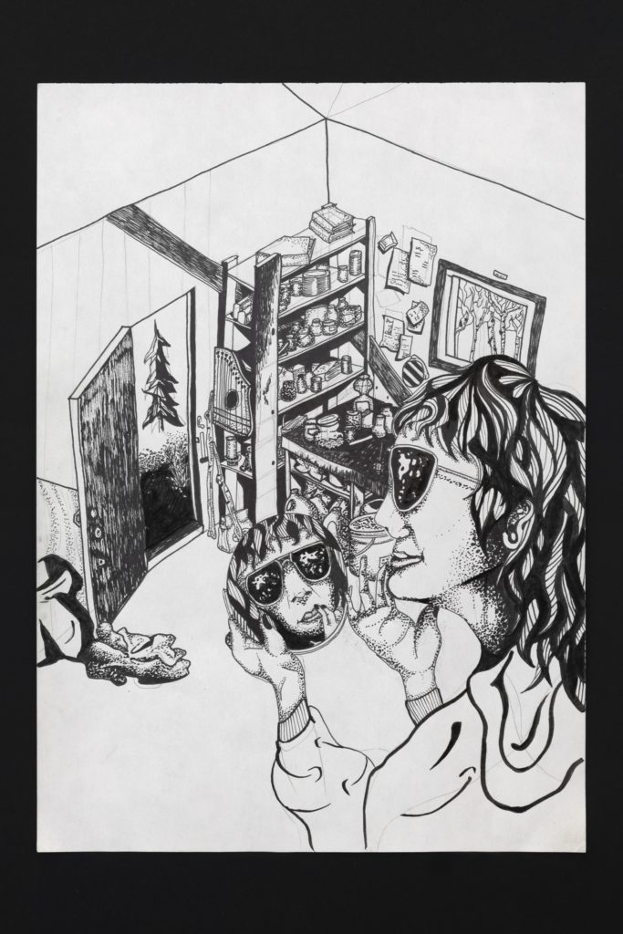 Materially, this refusal is articulated through works that privilege construction and fragmentation. Caspar Heinemann’s drawings Theodora and Her Cabin (Exterior) and Theodora and Her Cabin (Interior) (2023) are made in ink and marker, using dense line work and schematic shading that recall underground comics of the punk era. They reimagine Ted Kaczynski as “Theodora,” depicted within a log cabin interior populated by improvised chemical apparatuses and domestic fragments. The surfaces are rough and unstable. Heinemann’s sculptural works, assembled from mixed materials including wood, metal, and found objects, and partially obscured with black carpet tape, introduce physical redaction as a visual strategy. This aesthetic quality of packaging makes the sculptures appear as if they might physically contain other objects, treating concealment as a surface condition.