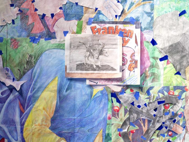 Sam Keogh’s large-scale collage The Unicorn Crosses a Stream Cartoon (2026), made from acrylic, watercolor, colored pencil, and painter’s tape on layout paper, operates through accumulation and structural layering. It draws together references from medieval tapestry, revolutionary pamphleteering, fantasy cinema, and contemporary surveillance systems. The work explicitly engages with The Hunt of the Unicorn tapestries, a late medieval series depicting the pursuit, capture, and possible resurrection of a unicorn, whose own history of damage, reuse, and institutional relocation becomes a model for visual circulation. Keogh’s use of painter’s tape as both connective and corrective material emphasizes the instability of images as they move across political and historical contexts. The mesmerizing visible labor put into this work, particularly in the carefully crosshatched drawings, points toward another register of politics: one grounded in time, attention, and the persistence of the hand (images of hands recur across the piece), resisting the frictionless reproducibility suggested elsewhere in the work. Activated through a performance that introduces a spoken narrative in which one of the characters searches for an origin point, only to be told by the other character (mediated through Keogh’s voice) that “there are no origins, only beginnings,” the piece itself expresses a multitude of beginnings, every working day.