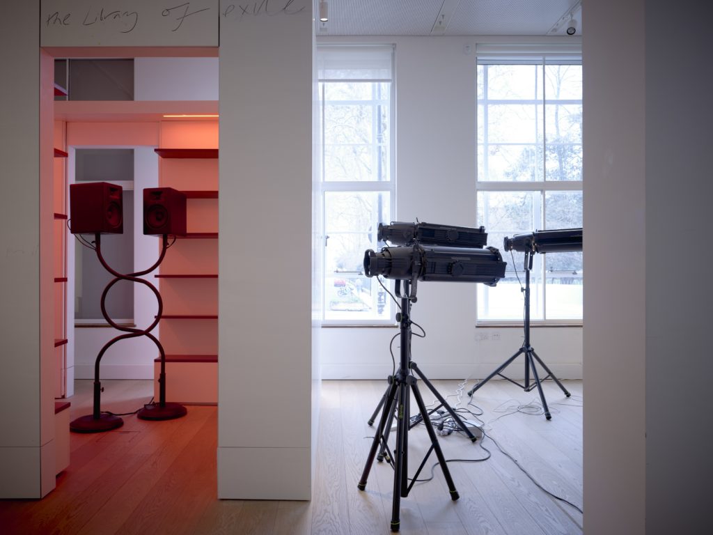 Shenece Oretha’s sound installation Conspiracy: After Jeanne Lee (2021), by contrast, is constructed through voice, speaker arrays, and warm red spatial lighting. The work arranges sound sources as if engaged in intimate dialogue, producing an environment of resonances. Two figure-sized audio speakers curl, entangle, and appear to embrace each other in a confined space. It seems as if we’re interrupting the work rather than being invited in. Drawing on the etymological root of “conspiracy” (conspirare, to breathe together), it reframes the term “conspiracy” as collective attunement rather than secrecy or deception. The reference to Jeanne Lee in the title is in relation to the American vocalist, poet, composer, improvisor, activist, and educator. More specifically, the work is named after Lee’s 1975 album Conspiracy.