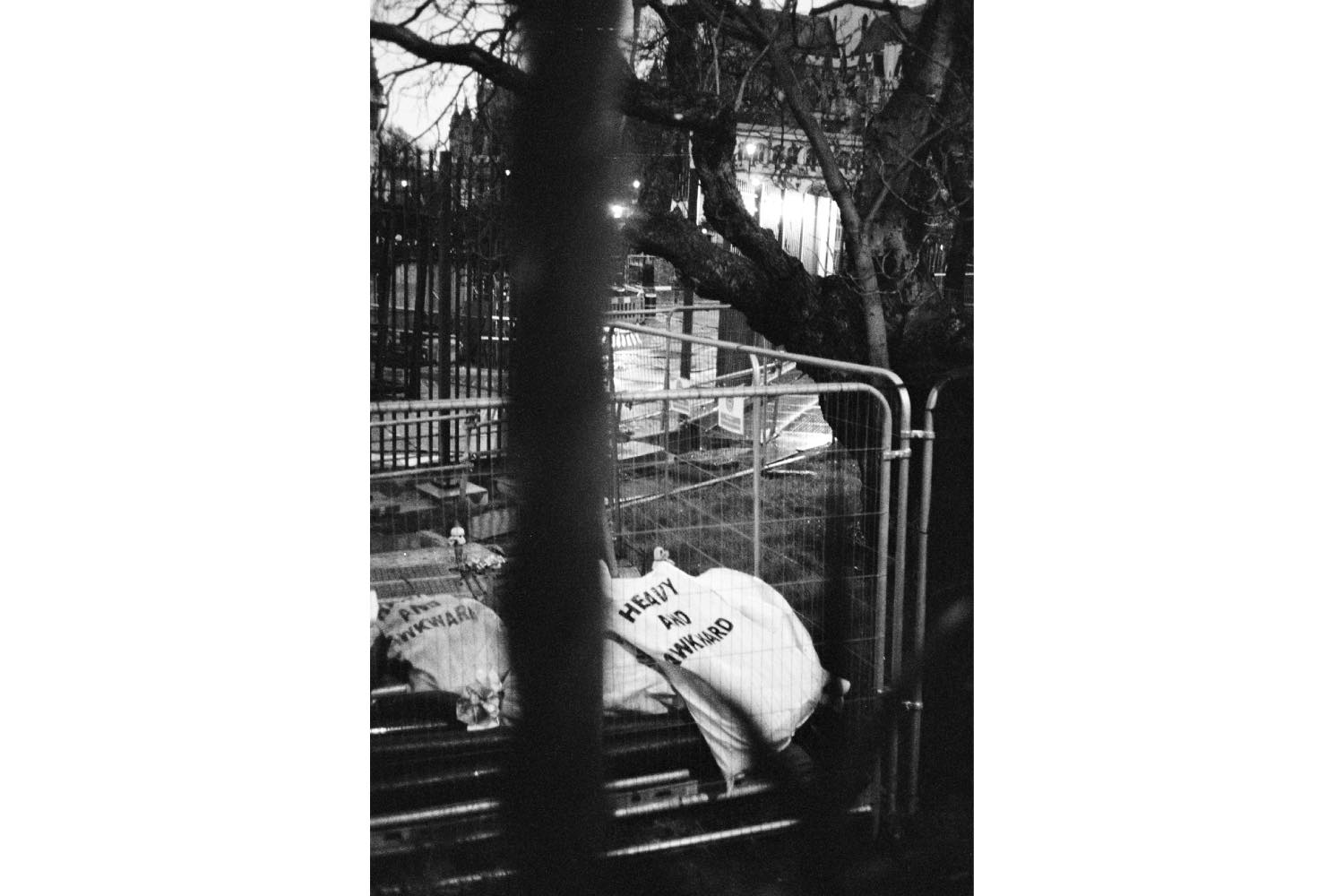 Much like a painter might paint en plein air, Gaillard’s output across mediums is birthed on site. One of my favorites of Gaillard’s works, The Land of Cockaigne (2020), follows Pieter Bruegel the Elder’s 1567 painting of the same name. The work by the Dutch master depicts three men sleeping off the effects of over-indulgent gluttony and was translated by Gaillard as an etching onto the cubicle of a Berghain toilet. The etching is an extension of the site, only possible to experience as a clubgoer likely feeling the effects of their own overconsumption. The Land of Cockaigne is a work that can’t be photographed and thus exists only in the memories of the lucky few who find it, intertwined with the stench of the club’s toilet and the low pitched resonance of bass.