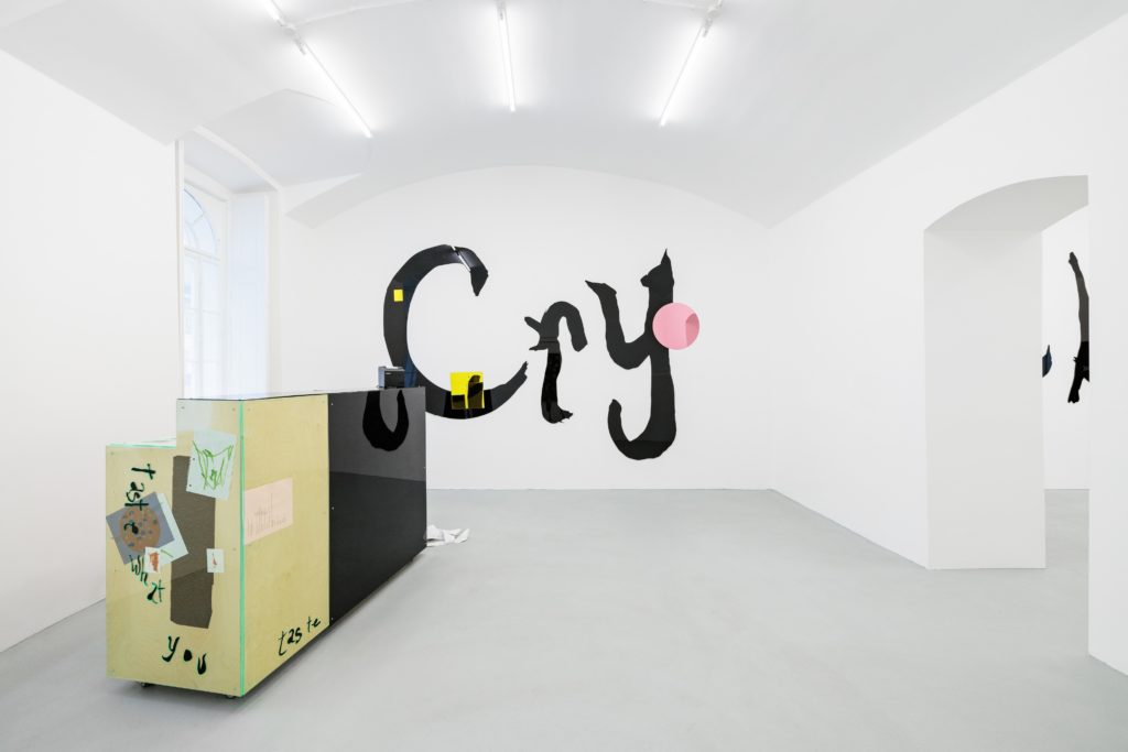 Qingyuan Deng: In “Cry Baby” (2025) at Kunstverein Gartenhaus, the space is filled with haunting references to language — for example, a slick brush-script silhouette with a hot-pink translucent disc lodged in the letterform, or overflowing paper ribbons from a smoked-glass table — that collapse the private/collective and personal/social. When you’re pulling from pop songs, overheard speech, fiction, and diaristic notes, what tells you a fragment is alive or charged enough to enter the work, versus just being noise?