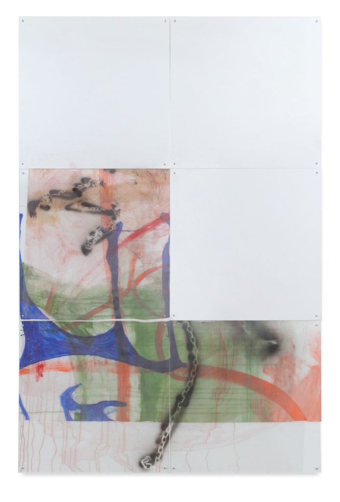RF: I’ve been thinking a lot recently about being attracted to someone that disgusts you. Like a villain in a TV show or a true villain in real life. Someone you truly do not like at your core. But you have a flash of a thought about having sex with them and you are then disgusted with yourself. I think that’s hard to describe in traditional painting or at least with my skill set. I enjoy the bodily sense I get when looking at such materials. I think of how it would feel to touch and handle them. I like how it feels when you look at it and see your distorted image reflected back. The sound of chains dragging around the studio floor. The material and the iconography I’m interested in or attracted to are often a mix of feminine, girly, not serious. Or maybe playful is a better word. Then I like to mix that with something industrial or something that reminds me of the mundane, like the trash at the bottom of a purse. I feel like these materials perform social contradictions that I want to investigate.