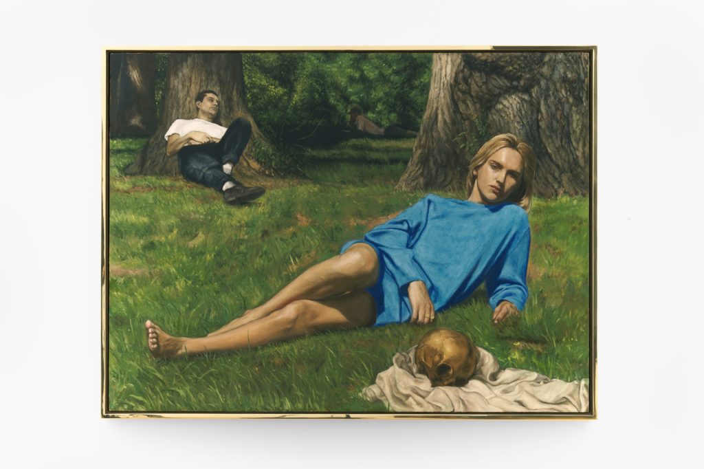 The nine paintings in “Résurrectine” continue in this vein: a mélange of interior and exterior scenes that chronicle a certain kind of creative class in New York, this time inflected through vanitas motifs and framed by gold, their surfaces mostly glazed to shine. The allusions are sometimes obvious. Beside the revisited Renoir, Rossetti paints his own version of Lady with an Ermine (1489–91) after Leonardo da Vinci, as well as his Saint John the Baptist (1513–16). Some viewers might also identify his subjects; I notice the painter Witt Fetter in The Gift of Life (2025–26), Rossetti’s rendering of Mary Magdalene as a Hermit (1833) by Francesco Hayez, but the rest — the woman with the red hair, Leonardo’s boy-lover double, the husbands — I have only the faintest clue.