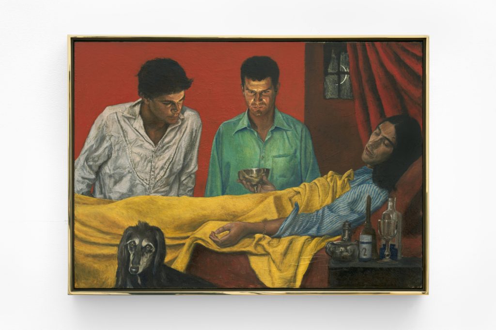 My ignorance, the paintings tell me, is no problem. Rossetti’s compositions are neither jokes nor codes, but rather subtly disjointed hallucinations that rely on, and revel in, painting’s illusory surface: its capacity to represent everything and nothing, and most of all, itself. Take, for example, Golden bowl, for their eyes were heavy (2025–26): the artist parodies himself as a dying Christ, his chalice miraculously illuminating the two “disciples” (presumably his friends). Yet this religious subtext, even if interpreted as burlesque, is too slight to hold together the painting’s more unwieldy dimensions.