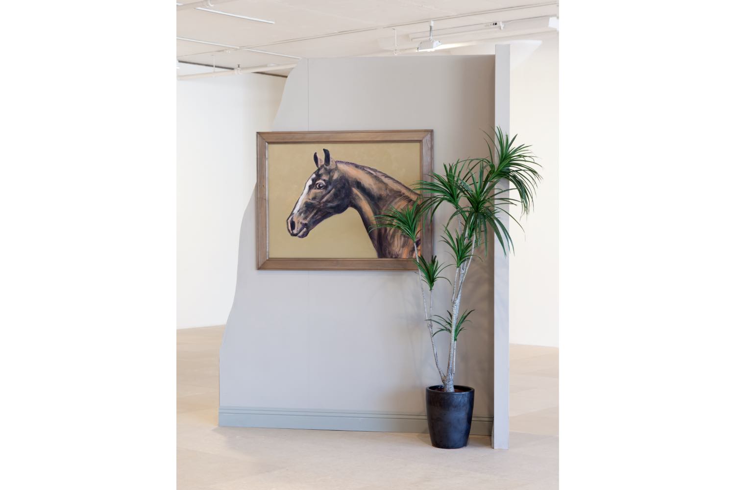 Many of the works in the exhibition depict some form of disaster or decay, whether real or fabricated. One of the first images viewers encounter that sets the tone for the exhibition is Untitled (Freeway Crash) (2002) by Florian Maier-Aichen, an aerial view photograph of one of LA’s signature freeway interchanges with an overpass snapped into chunks like a ribbon cut with scissors. Always ready to believe the truth of images, for a moment, I wasn’t positive the picture had been digitally manipulated. Nearby, in the second room, is Bill Leavitt’s sculpture Cutaway View (2008), a freestanding corner of a room made with plywood set walls, decorated with a framed painting of a horse, and a potted plant. One of the walls is cut irregularly, as if this were the set for a performance that has already taken place and is in the process of being broken down.