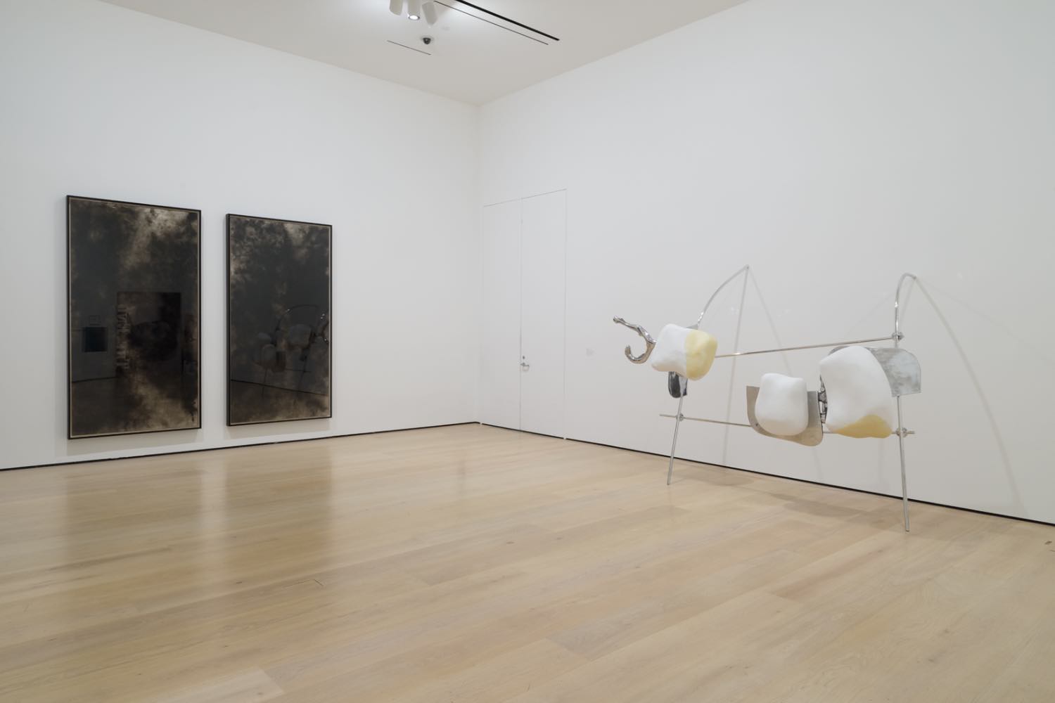 Around the corner, a series of drawings by Douglas Gordon illustrate the closing credits from unidentified 1950s films: “The End” is written over and over again, suggesting a cycle of endings. Also by Gordon are two panels with film stills of a man, who looks like he’s in acute distress, captioned with “The End.” The late Kaari Upson’s ghostly two-panel Untitled (2010) uses smoke and oil, and looks as if the artist had siphoned smoke from the atmosphere and placed it under glass. The work has a quality of movement that suggests something dissolving — another iteration of ephemerality.