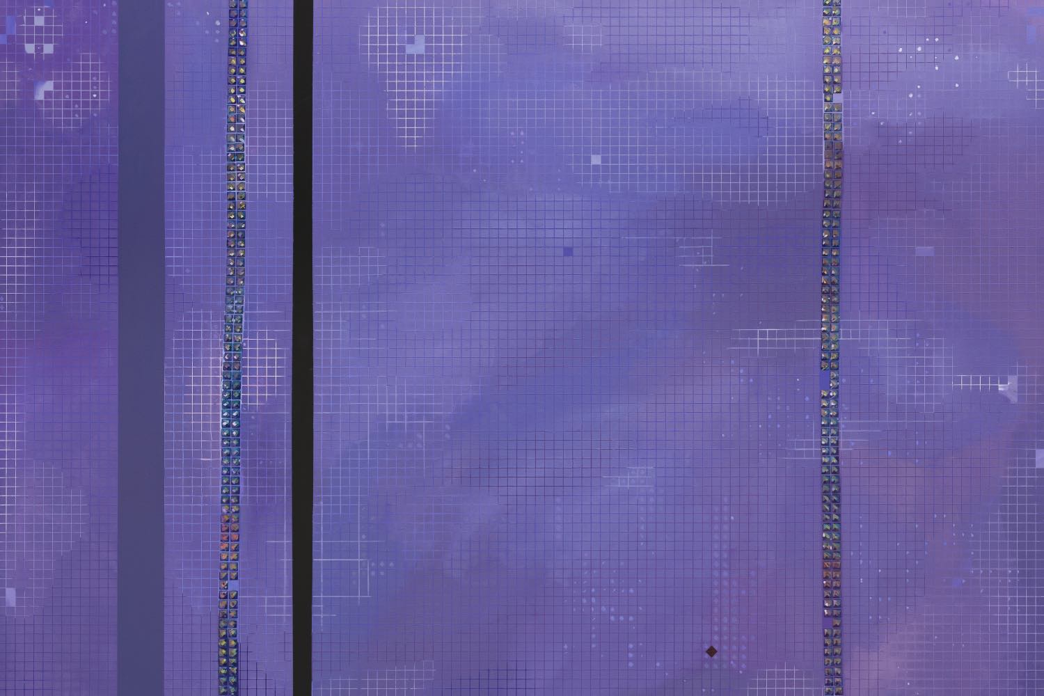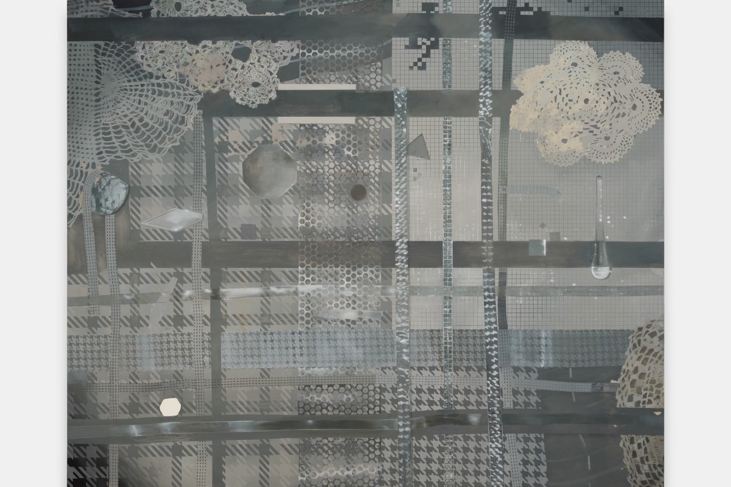 With the blown-out exposure of a white glow at the center of partyrockerXclearhistoric Large (2024), the artist recalls technology’s ability to imagine what isn’t there but could be, however seemingly minor the vision. Here, this spot of emptiness reads as the cross-section of a stage light beneath a synthetic, grape-soda-purple ground, or a techno strobe washing over a stage. Tight grids marked by flecks of paint, like pixels trying to generate data, avoid a horizon line and disclosure of their shadows’ source in sharp recognition of the abstract formal scaffoldings that signal display, theatrics, and performance, giving sci-fi movie poster and pop concert punctuated with silver star confetti. How do we hold on to humanness if artificial is the new authenticity? How do we slow down, but stay in motion? Maybe it’s a dance party, or just doing what it takes to feel real. In Isaacs’s words: “There is nothing more human than a person on the stage surrounded by the whole apparatus.”