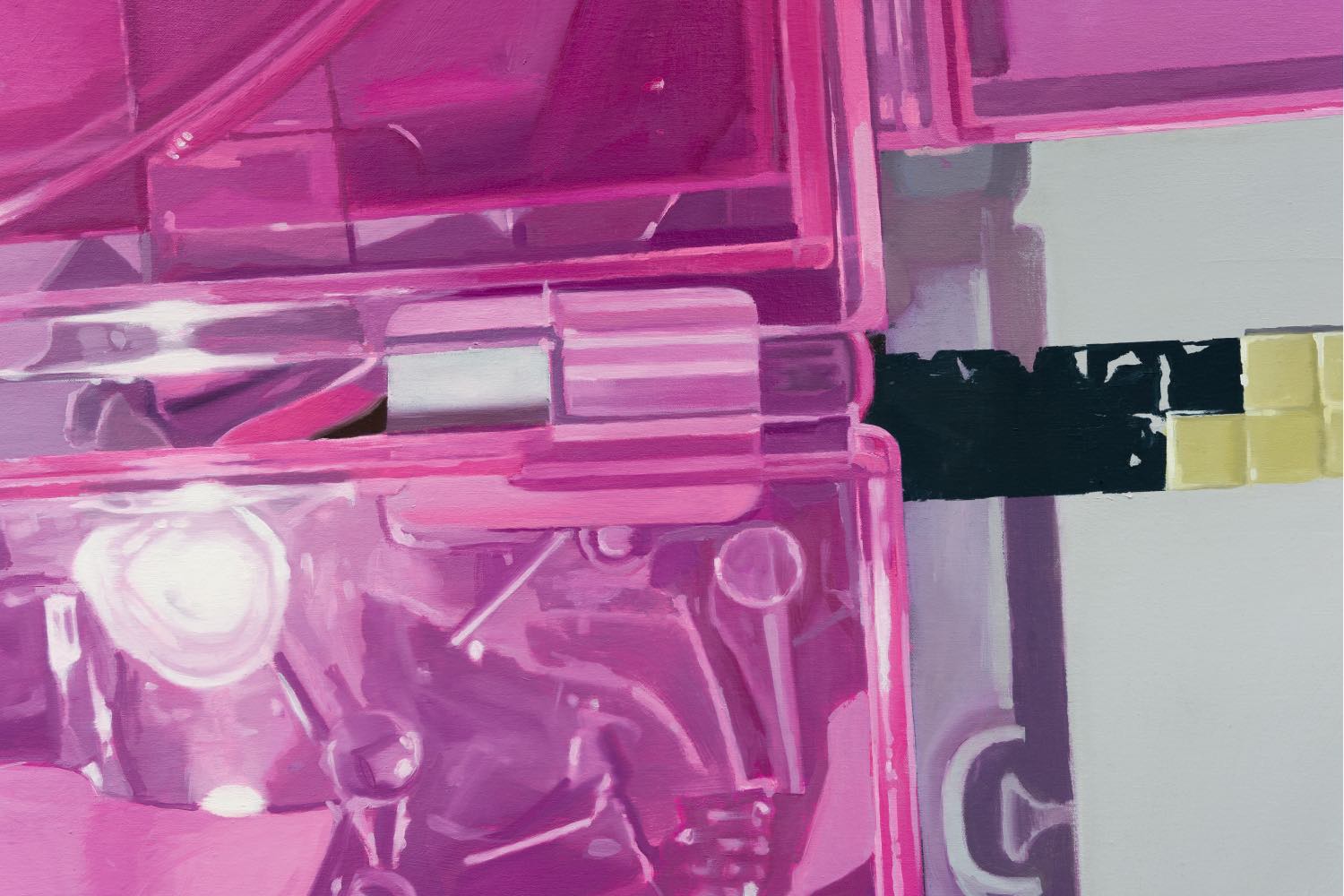 In turn, her works linger over visual forms and surfaces that are ultimately material to our experience of the world. A work called glassmagentaXdarkwhite Large (2023), from her 2023 solo show at Theta, New York, for instance, is a seductively inscrutable trompe l’oeil still life of an empty plastic CD case and a gathering of metallic-tinted ribbon like some unidentifiable mechanism, complicated by its compositional framing in a transcendent halo of modernist abstraction’s idealized elements of red, blue, and yellow. While reminiscent of a scientific optical diagram and celestial orb, the protagonist is a mass of bubble-gum-pink light you’d want to bite but know will taste rancid, rendered in buttery, sumptuously applied oil pigments yet detached as if captured by a fish-eye-cam lens. The result is a morphing of our bodily senses lulled to sleep by the trance of an ASMR makeup-contouring video and yanked out by the deadening air of sickly syrupy artifice, pumped out like the signature Bath & Body Works aroma of the artist’s mall culture youth. This isn’t toxic positivity, just a reality check on the “unreal” permeating our daily lives with tangible immediacy.