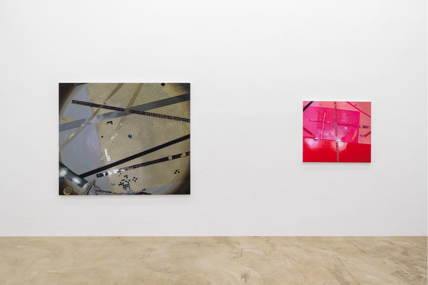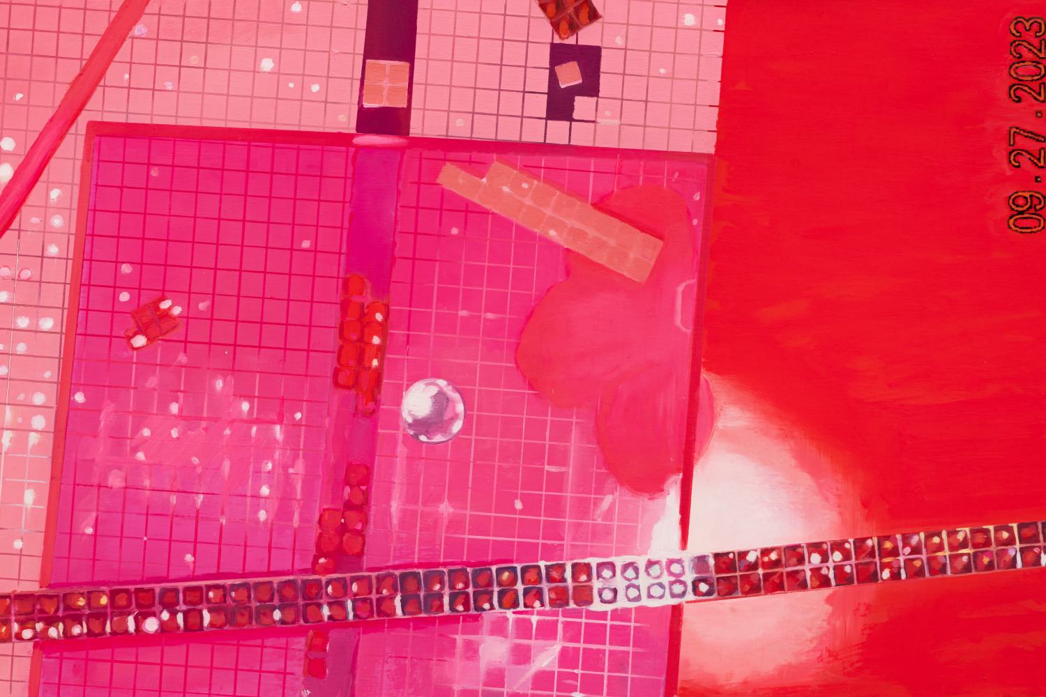In youngfreak Small (2024), a chromatic study in hot pink and red included in her eponymous exhibition at Clima, Milan, bedazzled jewels as geometric stripes further pervert the so-called objectivity of abstraction and the technological realm with micro-opulence and signs of the author. The work primarily calls attention to the simulation of Abstract Expressionism’s spiritual claims to unmediated subjectivity and divine expression; once you see Barnett Newman’s iconic zips in the vertical stripes on partyrocker Large (2023) and its violet expanse, you can’t unsee it. Positioned near the painting’s edge where a signature might be, the painted digits of the camera’s date stamp, “09.27.2023” offer a kind of temporal suture, periodizeing the image apparatus as author, laying bare the relationship between image, body, and world in a new kind of indexical relation and existential reckoning where human and emotion and device are inseparable. Like a live performance on stage, the visible construction spread out before you affords a new understanding of reality in which attention to form can revive a form of idealism, or at least a heightened awareness of the time-space-continuum that we know.