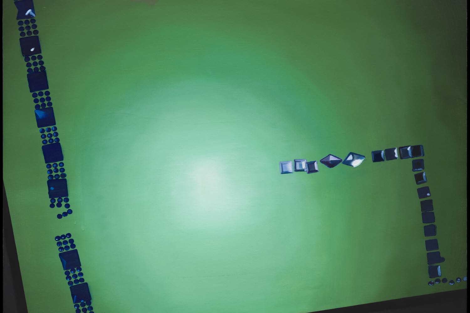 Kelsey Isaacs’s shower floor is home to a sculptural tableau that quite literally sets the stage for a practice in search of ways to “touch an image,” in the artist’s words, in a moment defined by all-pervasive image theater. Comprising mirrored tiles and sequins, unspooled ribbons and strips of plastic bedazzling gems choreographed in miniature arrangements — sometimes accessorized by a toy disco ball or sparkly pen — her mise-en-scènes of ebullient junk-drawer décor miscellany are provisional, phantasmagoric prisms of “nothing” assembled only to be photographed like so much of our existence. Did you do it for the jpegs? Did it happen otherwise? The effect is decidedly material and incorporeal — reflecting, refracting, and pooling viscous spotlights fashioned from handheld flashlights and flashes of digital point-and-shoot cameras from the recent past and early 2000s. Akin to so many desperate snapshots seeking to arrest every fleeting thing, Isaacs takes hundreds of photos of these lo-fi dreamscapes in the bathroom of her New York studio before choosing one to paint to brilliant, Candy Crush-luminous effect.