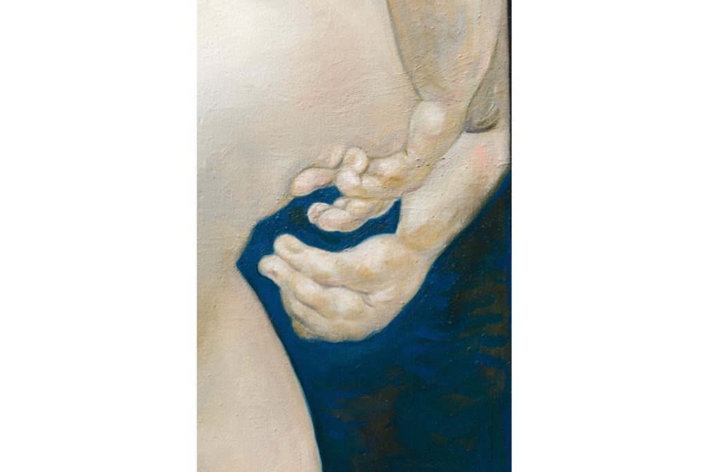 This solitude and default setting provides a strong and intentional contrast with Louise Bonnet’s Rabelaisian bodies on canvas. Figures are stretched, enlarged, engorged, and encroaching on intimate painted spaces. Painted with delicacy and warmth, the spaces we see are abstract yet feel safe, overtly referencing sixteenth-century Dutch genre paintings. Bodies are larger than life, almost bloated and self-important, self-centered to make a statement. To make them more relatable, Bonnet uses the intimacy of gestures and small details. A figure turning away from an iris flower, buttocks also turning away from a chamomile bouquet, a naked figure zipping up an invisible pair of pants next to a chinoiserie treasure, a multi-nipple white vase mirroring a multi-nipple flash nearby, two lonesome lemons or apples hanging next to an enlarged crouching or reposing silhouette, hands manipulating a foot next to a half-eaten purple fig on a plate. Bonnet reportedly consulted the Special Operations Executive manual — an instruction guide for British spies during World War II — when creating this series. It offered directives on how to appear native in a foreign land, warning, for example, that putting hands in one’s pockets could betray a cover. Her figures perform humanity, their forms begging the question: How do we know when someone is truly “human”?